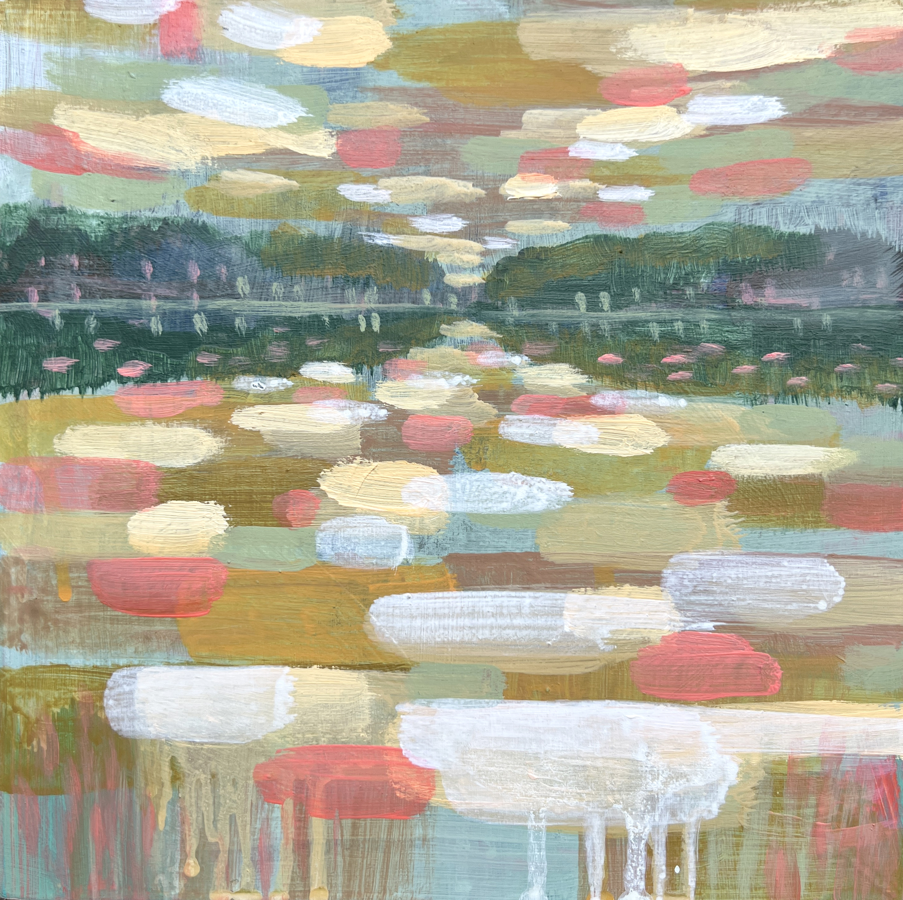 This piece focuses on creating the experience of being in a magical and happy place where the viewers can feel uplifted and invigorated. Here, the reflection in the water is no longer representational but is becoming an inner reflection of the artist herself which is expressed in a rhythmic harmony... Read more