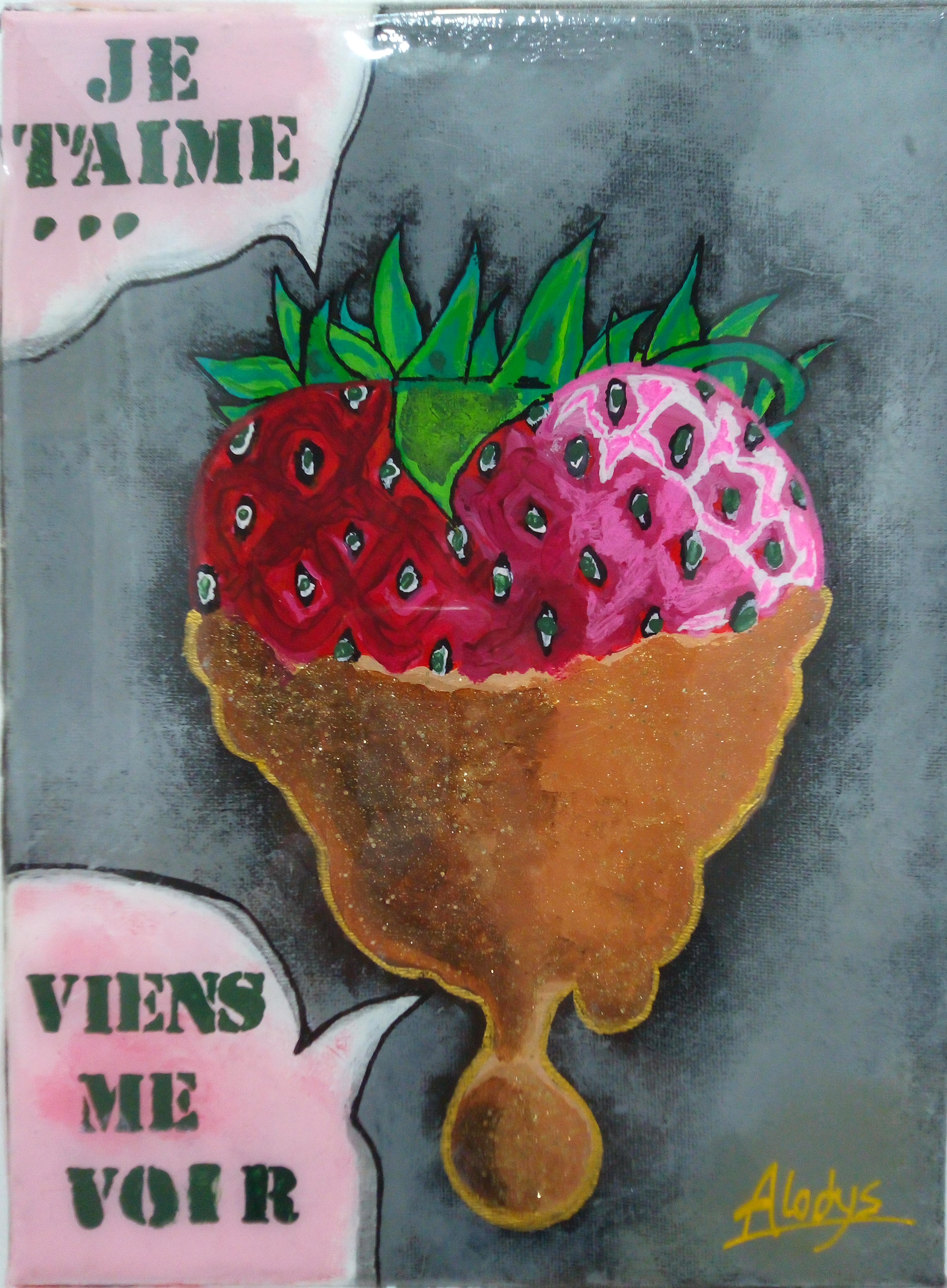 C'est une oeuvre romantique , inspirée d'une soirée en amoureux que j'ai passé avec mon conjoint . Nous avions mangé une fondue au chocolat avec des fraises ensemble . C'est une toile aphrodisiaque . réalisée au pinceau avec de la peinture acrylique , du vernis a ongles a paillettes et... Read more