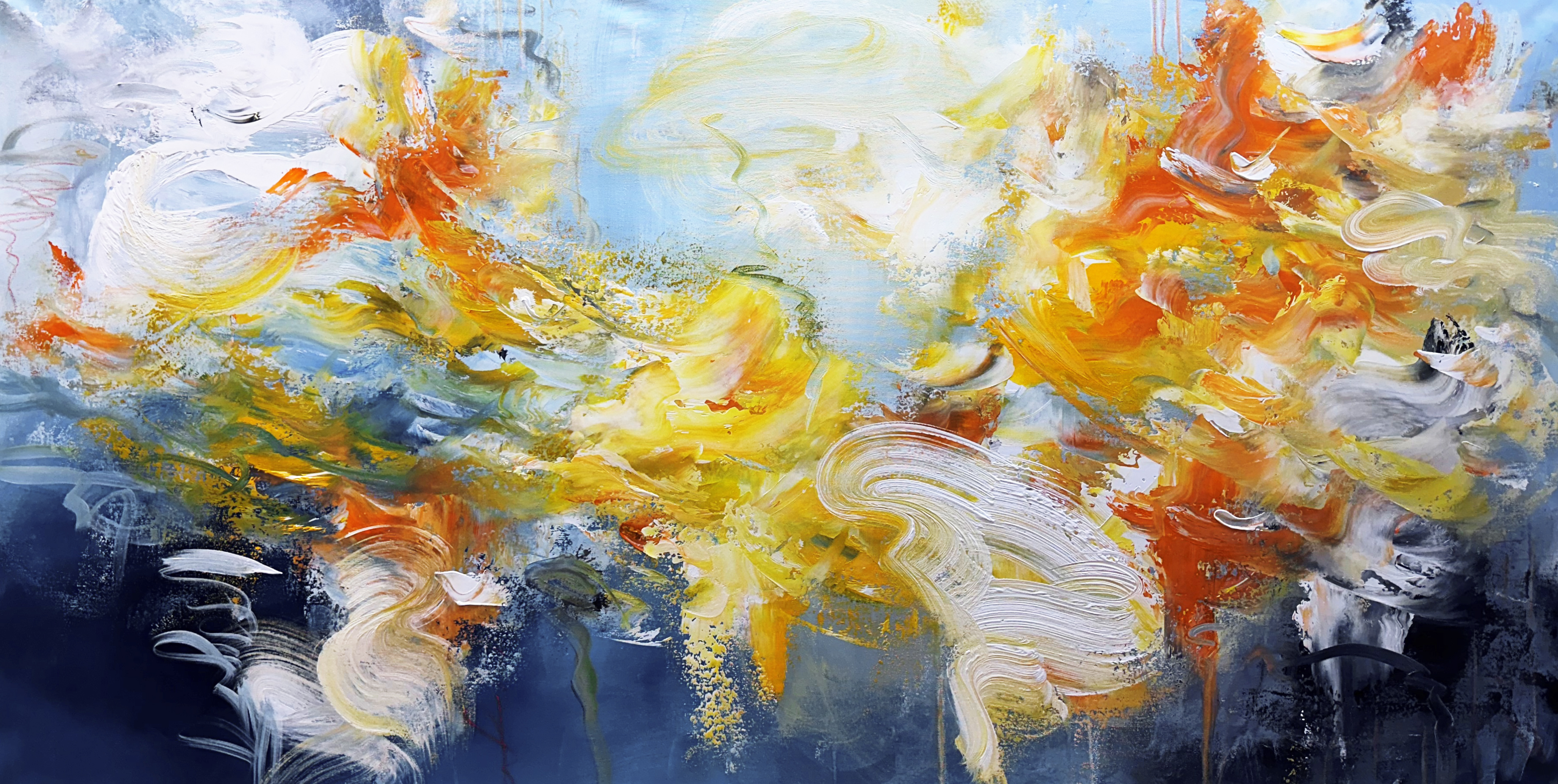 "Swirling Harmony," an abstract painting on vibrant shades of blue, orange, and yellow, evokes a sense of movement and balance and it would be perfect for any modern space. This gorgeous painting adds a touch of energy and warmth, making it an ideal centerpiece for your home or office. -... Read more