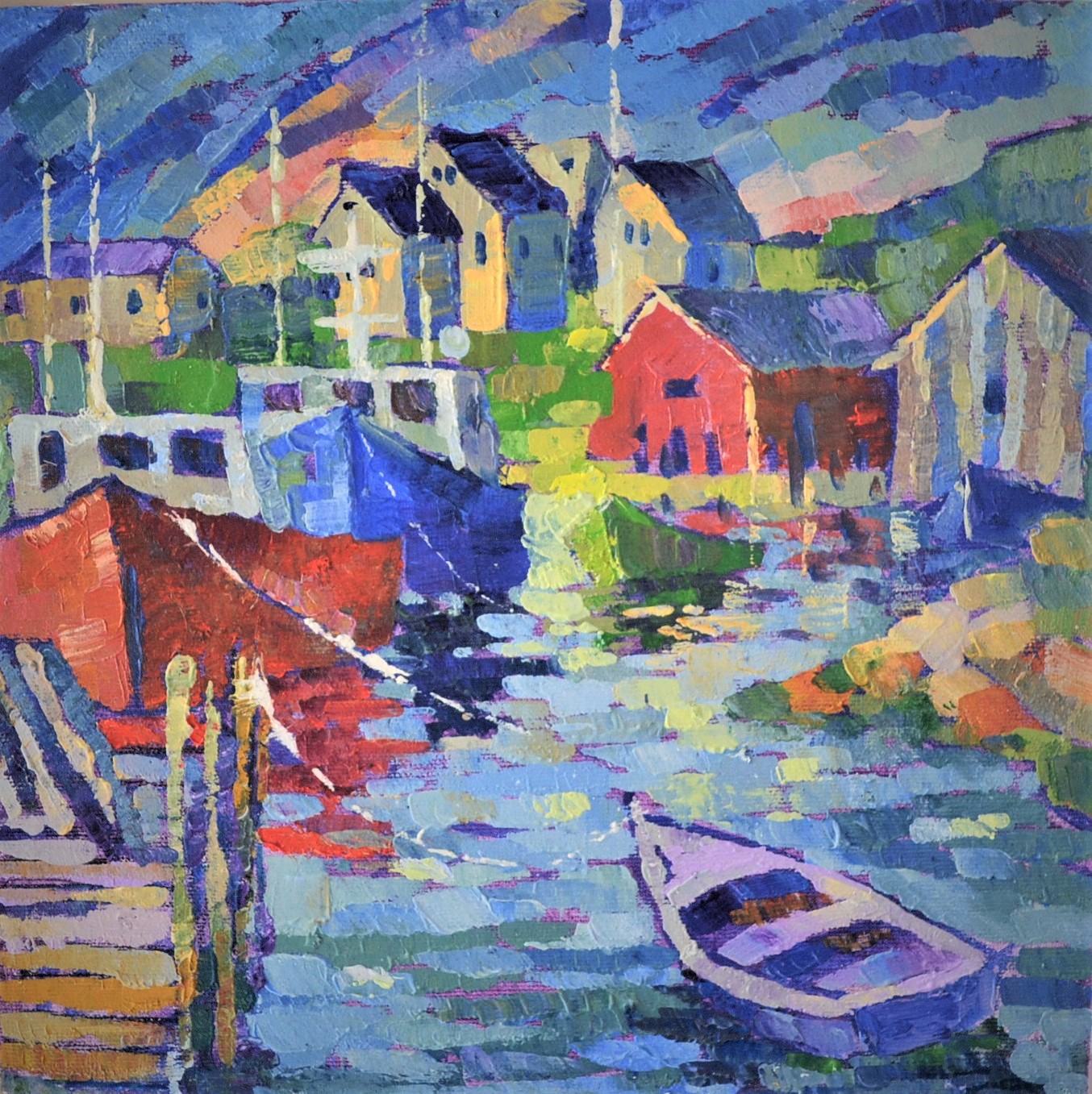 The crystal waters of a Peggy's Cove, Nova Scotia catch harbour reflections like a mirror, glimmering with hues of blue and green. A bright sky above gives a hint of the fall to come, and this painting captures the magical moment of color before the sunset. This original oil painting... Read more