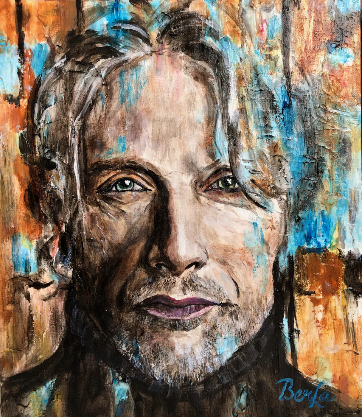 I inspired by one of the Mads Mikkelsen's (actor) photograph. It is acrylic painting (professional degree) on canvas board. I used heavy gel medium for the texture; finished with satin varnish.