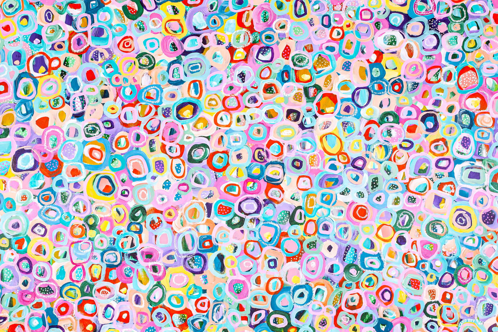 PRÊTE À ACCROCHER ! Peinture originale sur toile tendue. Oeuvre abstraite colorée et joyeuse peinte dans mon style “bubulles”. Motif de cercles concentriques et de pois qui peuvent faire penser à une vue aérienne d'un champ rempli de fleurs colorées. Palette de couleur : rose, bleu, lilas, violet, turquoise, sarcelle,... Read more