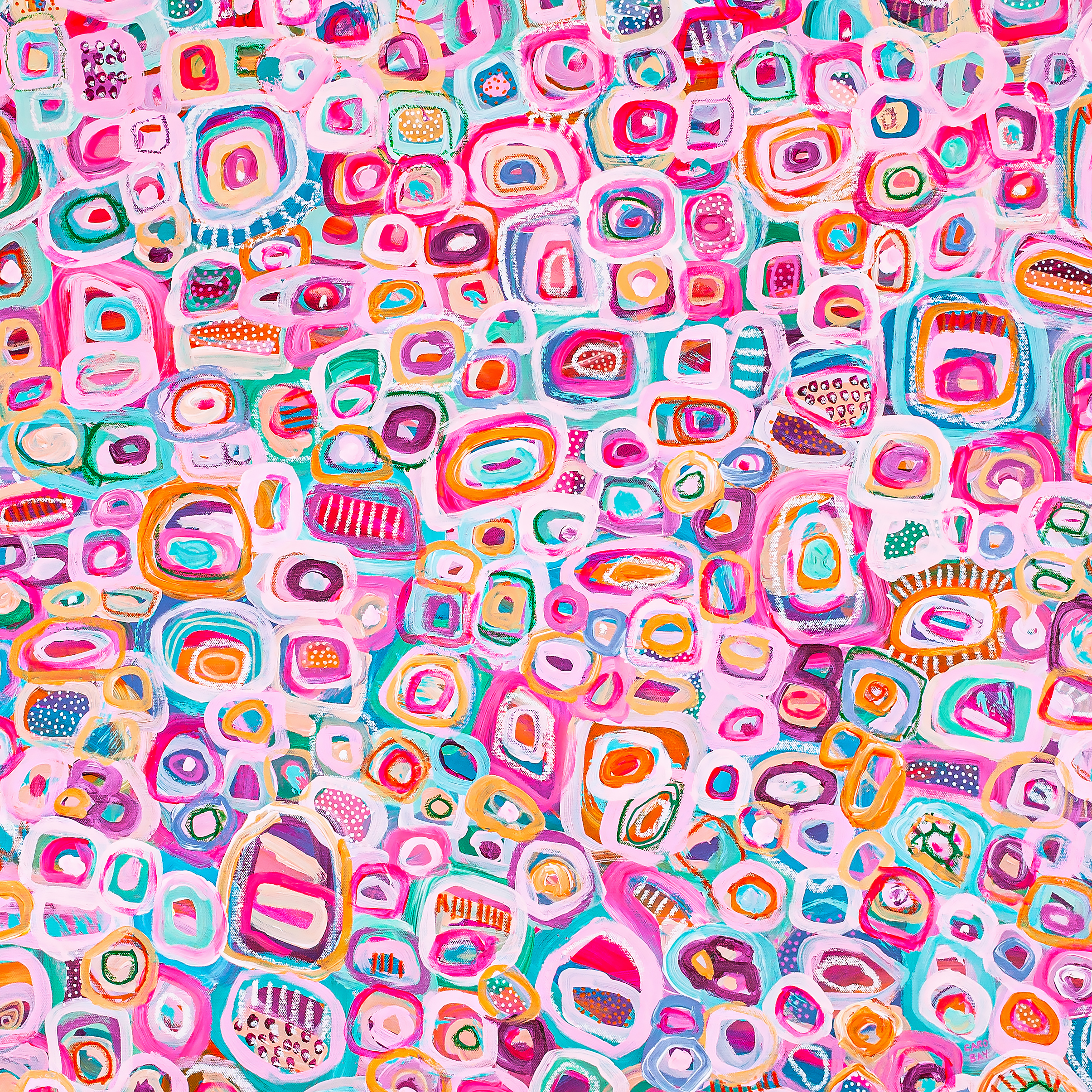 PRÊTE À ACCROCHER ! Peinture originale sur toile tendue. Pour les vrais amateurs de rose ! Oeuvre abstraite colorée et joyeuse peinte dans mon style “bubulles”. Motif de cercles concentriques, de pois, de lignes et de bien d’autres détails. Palette de couleur : beaucoup de rose - incluant du rose... Read more