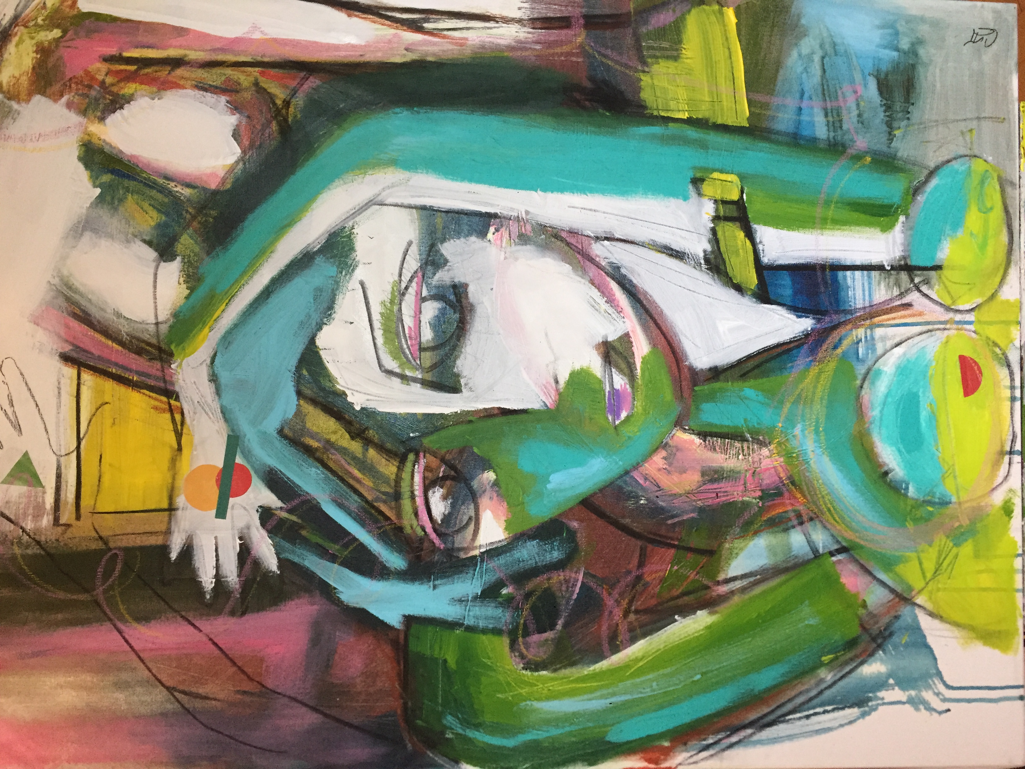 Des formes géométriques en papier ont été collées sur la toile: Les formes qui font référence aux courbes/formes du corps féminin qui nous préoccupent tant.