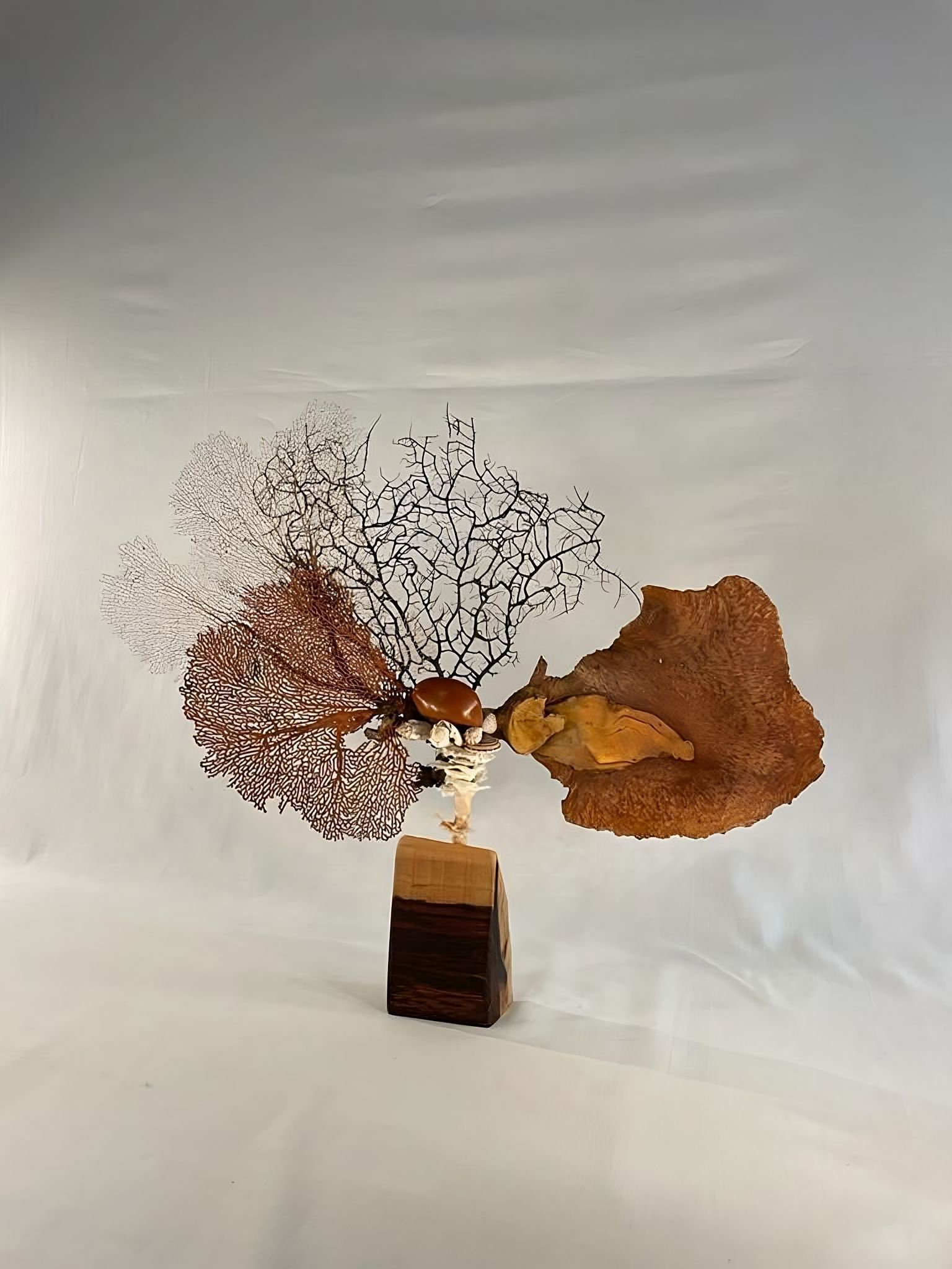 Animal mythique aquatique à respiration aérienne, en ronce de bruyère et épine vinette, à la queue en gorgone beige et gorgone corail aussi grosse que sa tête. Ovipare Hermaphrodite au seul œuf, en graine de karité couronné d’un éventail de gorgone noire, niché sur un lit de coquillages, lui-même perché... Read more