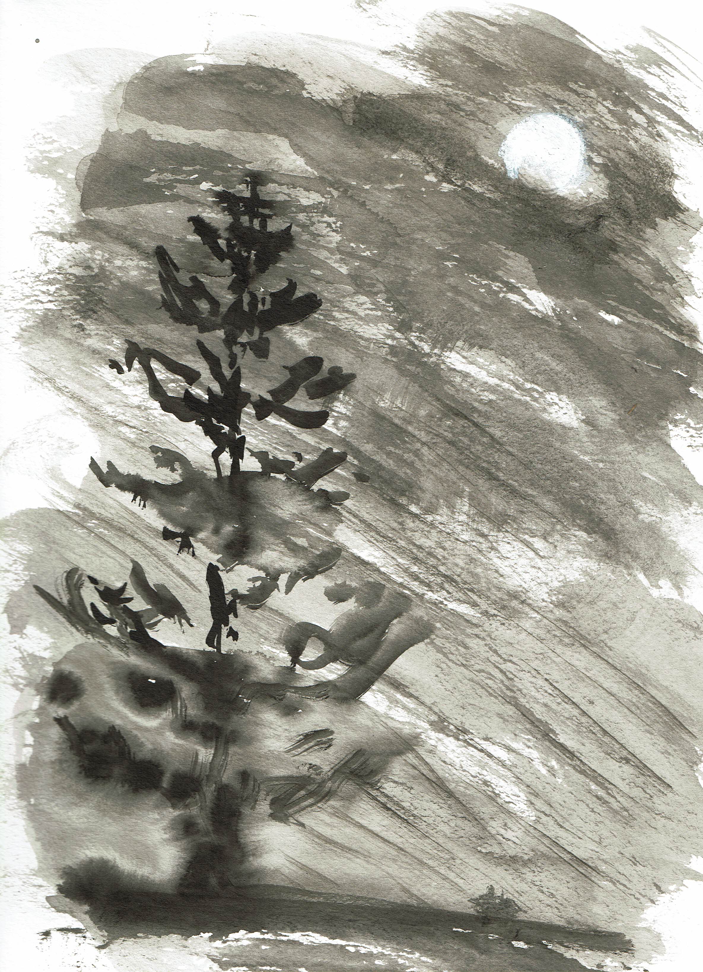 Décembre, c'est pleine lune qui perce les nuages. Il neige pour la première fois sur le sapin. Dessin original, encre sur papier Arches encadré (cadre noir inclus).