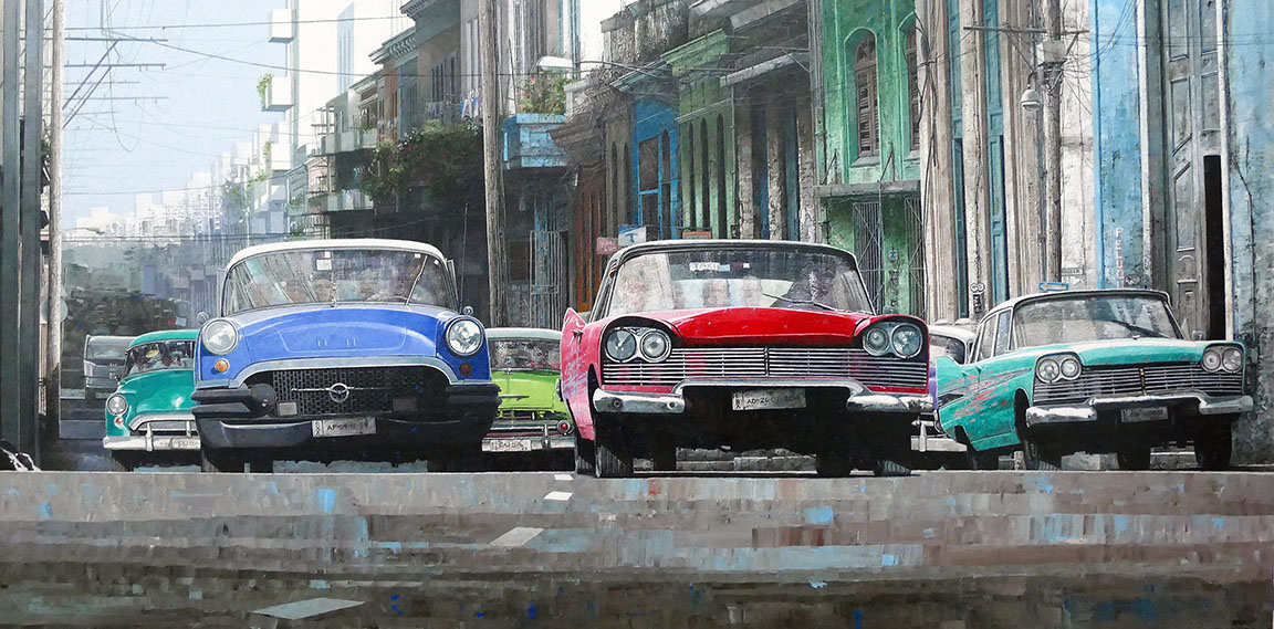 Havana, Cuba Acrylic on wood panel Painting size - 24" x 48" A parade of colour and a parade of vintage cars along a busy, somewhat hilly, Havana street. Up and over they come and then, there they go, speeding off to various destinations, the bright sunshine reflecting off them... Read more