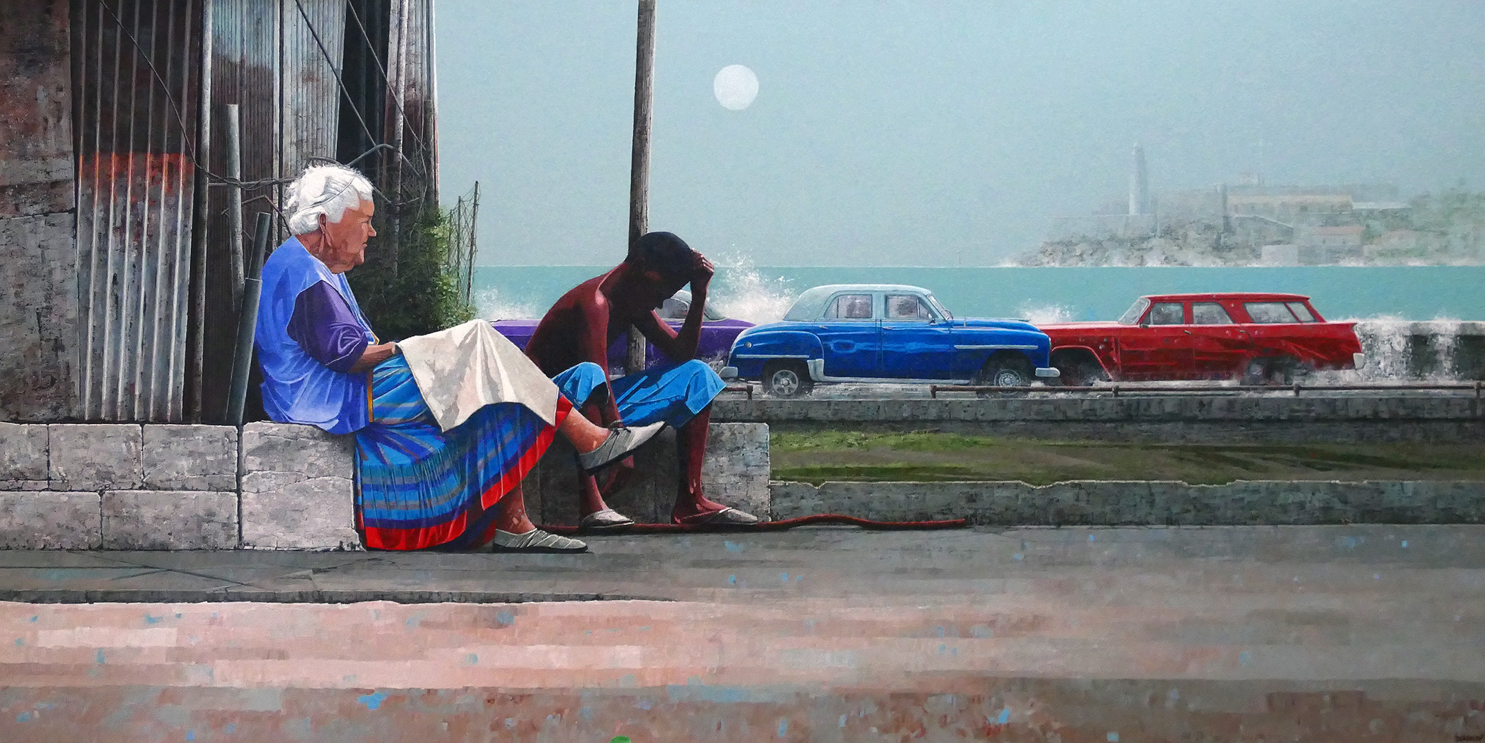 Havana, Cuba Acrylic on wood panel Painting size - 30" x 60" A misty day in the city. A haziness in the air...perhaps some rain on the way. As the weather changes the waves start to kick up and over the wall on the infamous, "La Maleçon". As the vintage... Read more