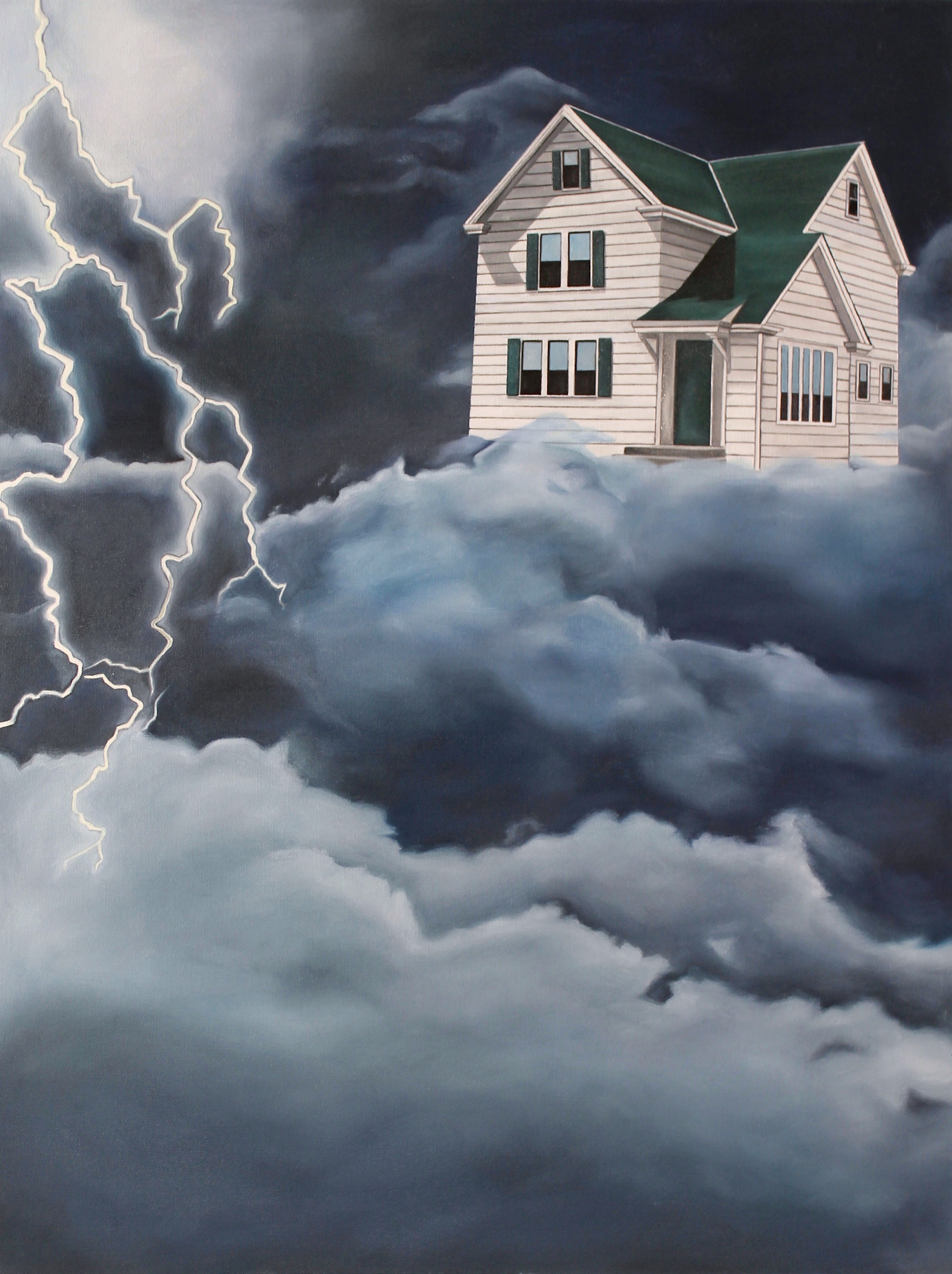 Just an average house, floating among the clouds in a thunder storm. One can only imagine what's going on inside... This painting is part of a series entitled, "Strange Happenings & Rare Findings". This collection of surrealistic oil paintings explores an alternate dimension through unlikely and curious scenarios. This series... Read more