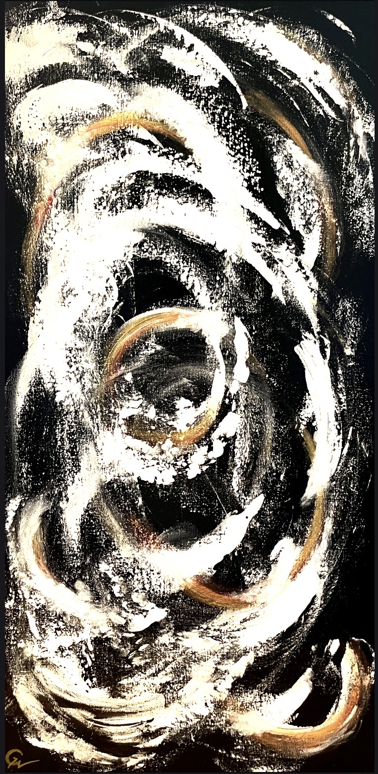 Infini en mouvement, noire et blanche avec un mouvement d'or et une fine ligne de rouge, une toile/chassis galerie de 36x18 pouces