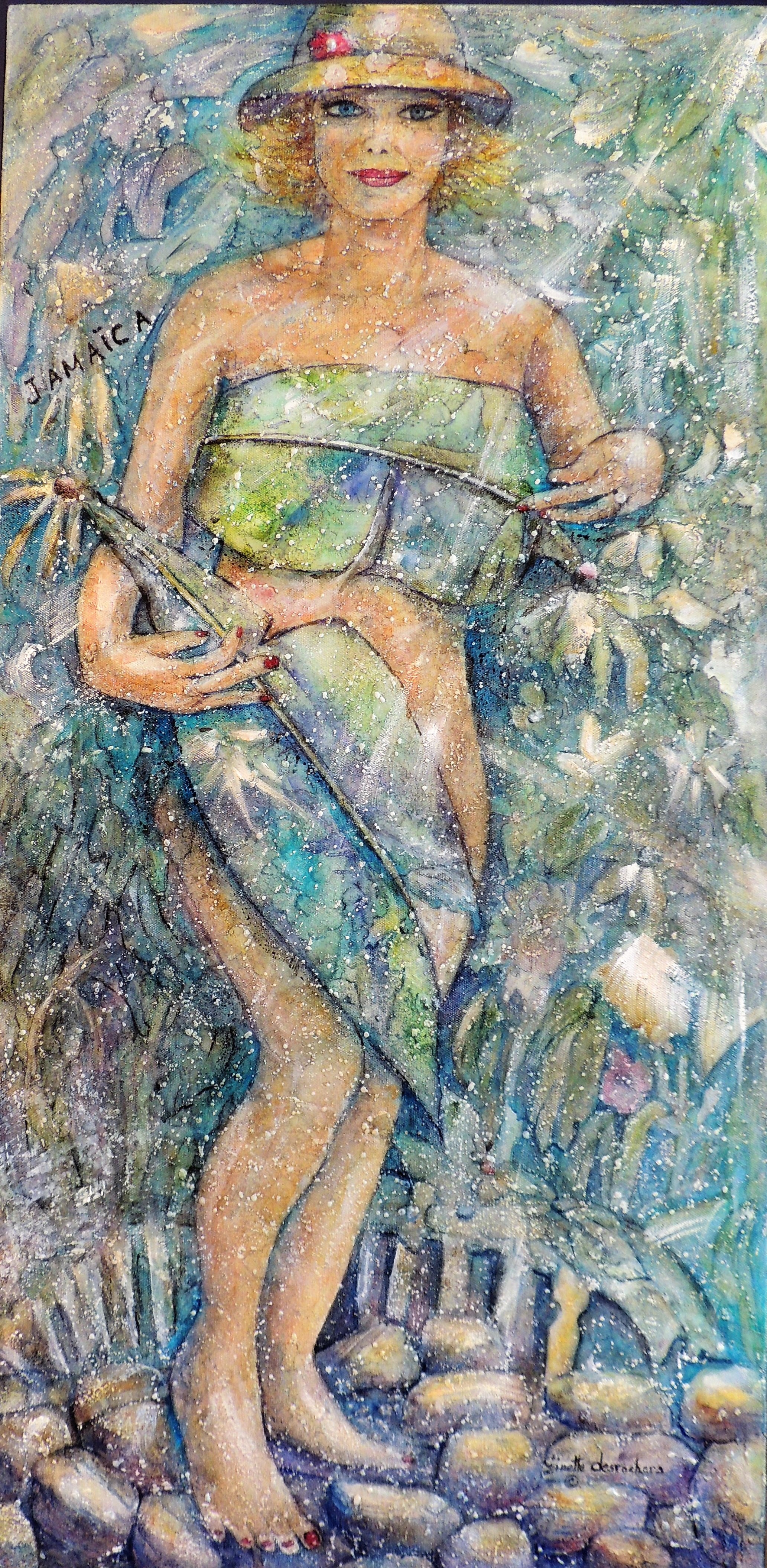Tableau inspiré d`un voyage en Jamaique. Une femme se couvrant de feuilles de bananier. Savoir profiter des bienfaits, plaisir de la nature. Belle évasion en ces moments difficiles.