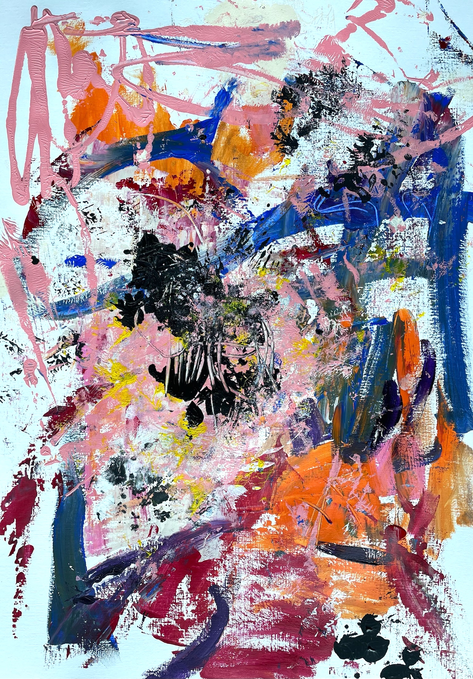"Catching Up" is an abstract modern acrylic painting on paper. It is painted expressively and gestural-dynamically. The main colors are blue, orange, pink and black. The artwork is full of movement and vibrancy. The painting is signed on the back. Title and date of origin are also on the back.... Read more