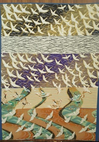 Collage with Japanese Paper (Chiyogami) representing a flock of cranes and the coming of spring