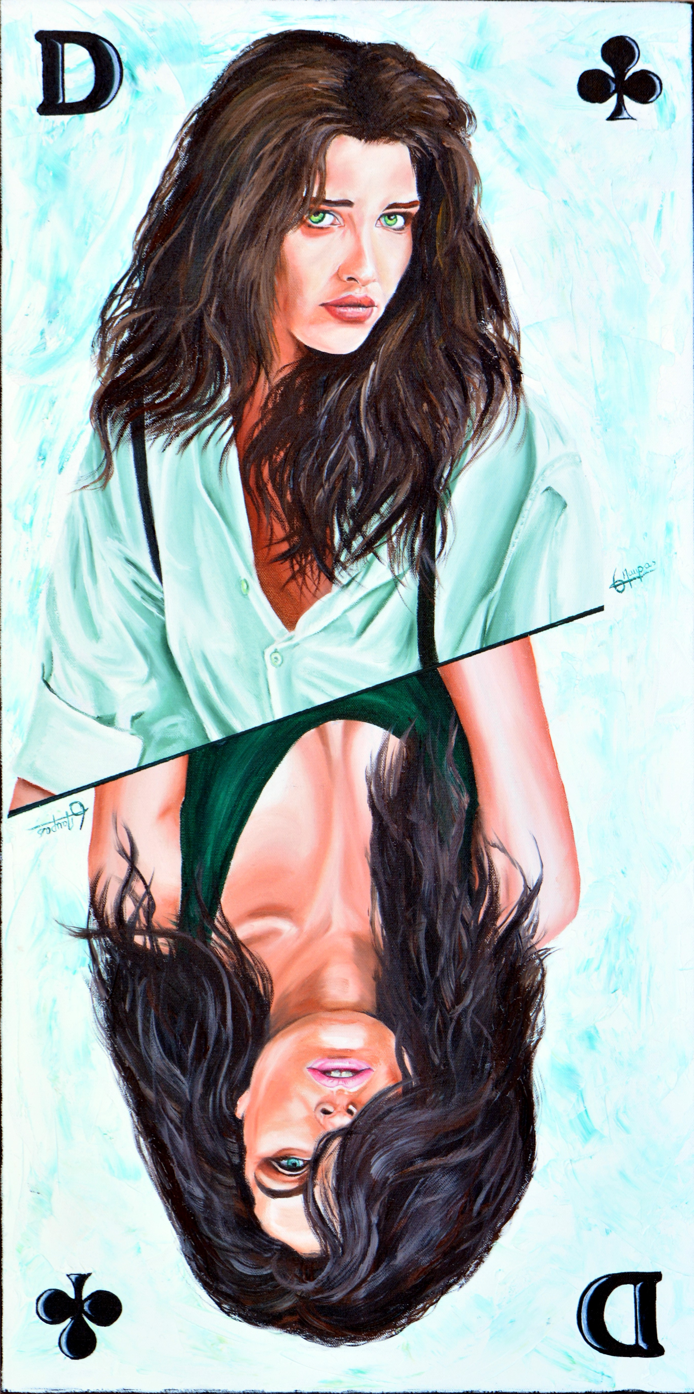 Portrait de deux femmes brunes en tête-bêche dans l’esprit d’une dame d’un jeu de cartes, avec séparateur oblique et symboles D et Trèfle en noir, avec une légère dominance de couleur verte et réalisé sur châssis 3D avec bordure en noir. Système d’accrochage au dos de la toile permettant de... Read more