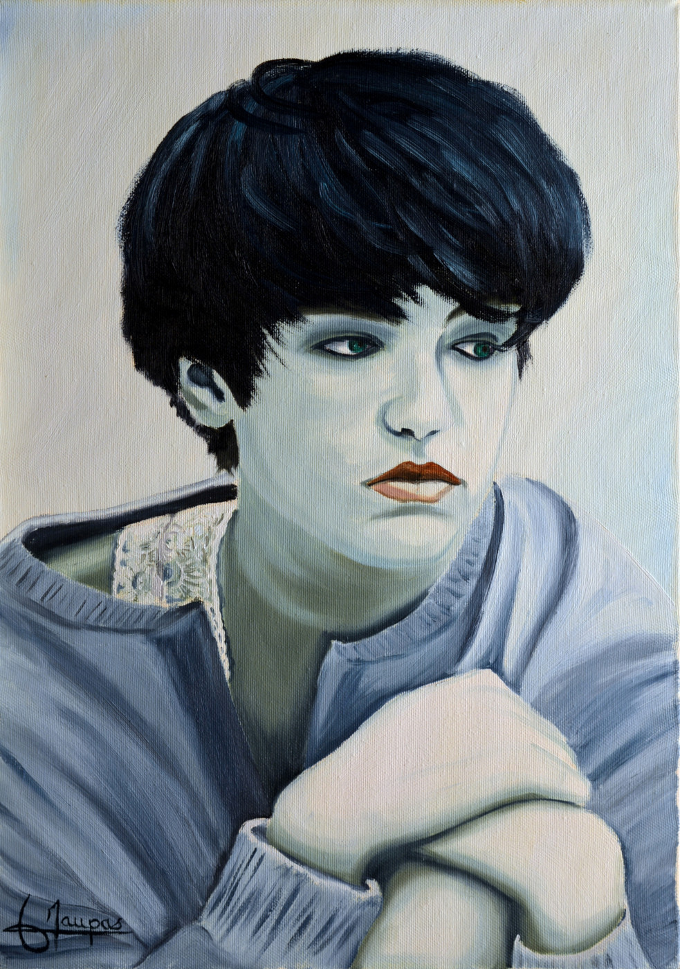 Portrait femme en bleu à la moue boudeuse - Fait partie d'une série de 4 portraits réalisés en août 1992