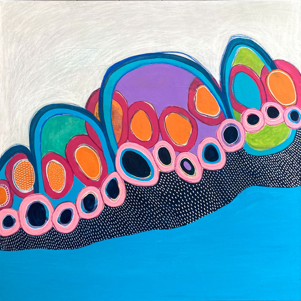 Envers et contre tout est une oeuvre originale peinte à l’acrylique surtout mais accentuée aux crayons aquarelle et à l’encre . Dans la collection «cultiver la joie et les sentiers irréguliers» celle-ci est un jeu de cercles diamétralement irréguliers, qui s’alignent et s’imbiquent. Cette création dont les couleurs vives, bleus,... Read more
