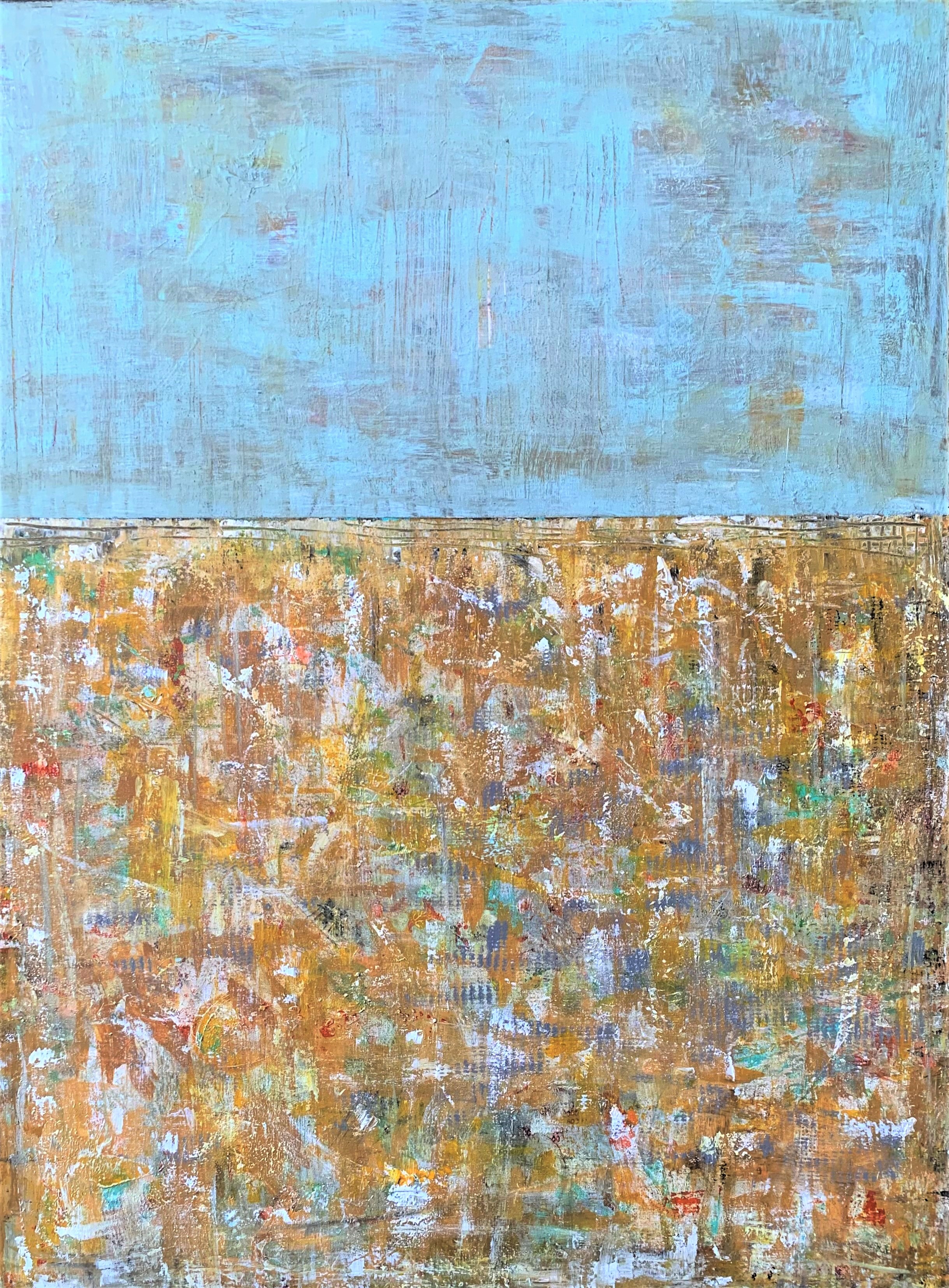 Painting: Acrylic on Canvas. Part of my minimalist series, this work was inspired after seeing an early fall sky that was a chalky aqua blue and it shone over the turning colours of autumn, making them sparkle in the late light of day.