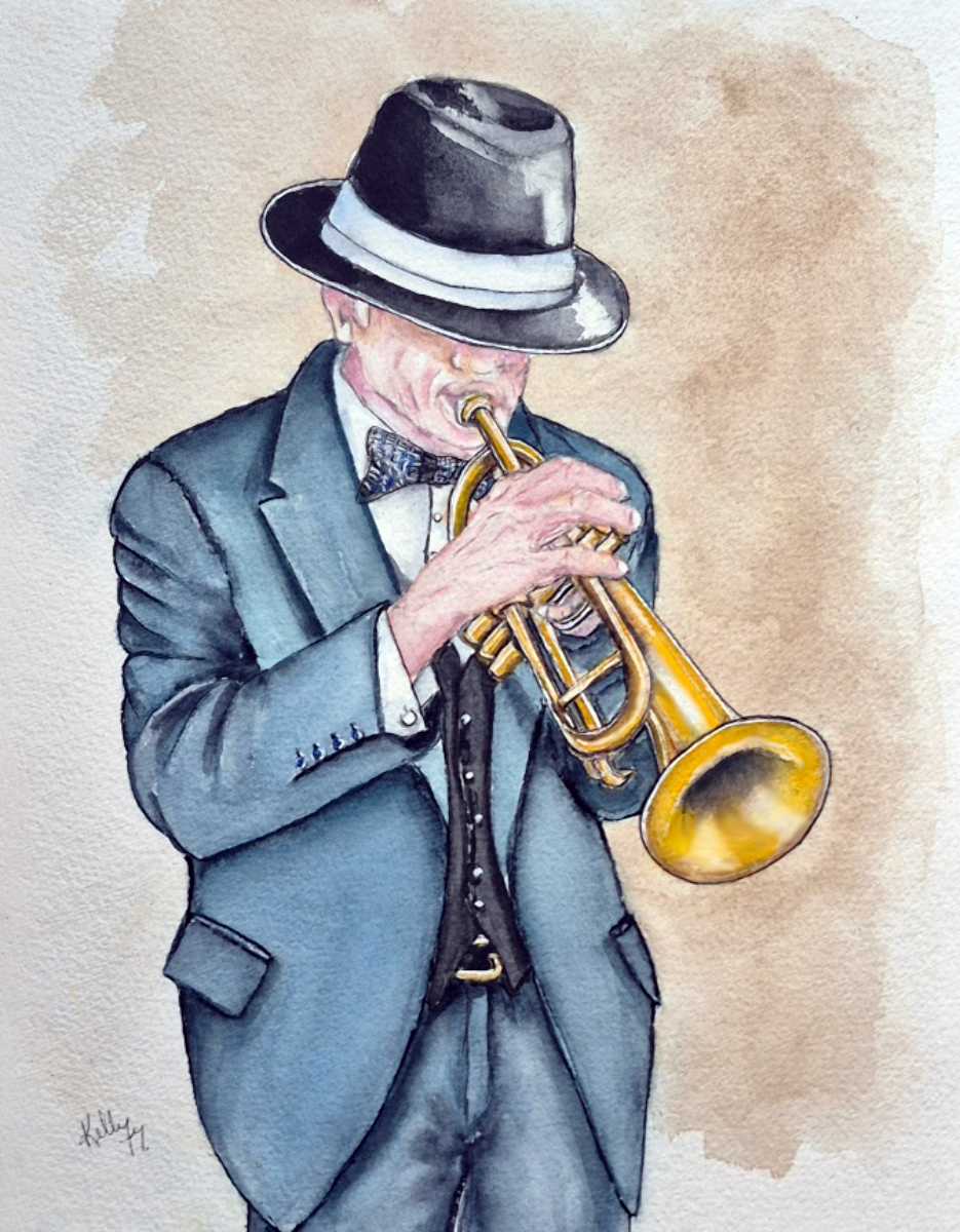 Trumpeting to the Blues is an original watercolor on 300lb Arches paper. 14" x 11" in size