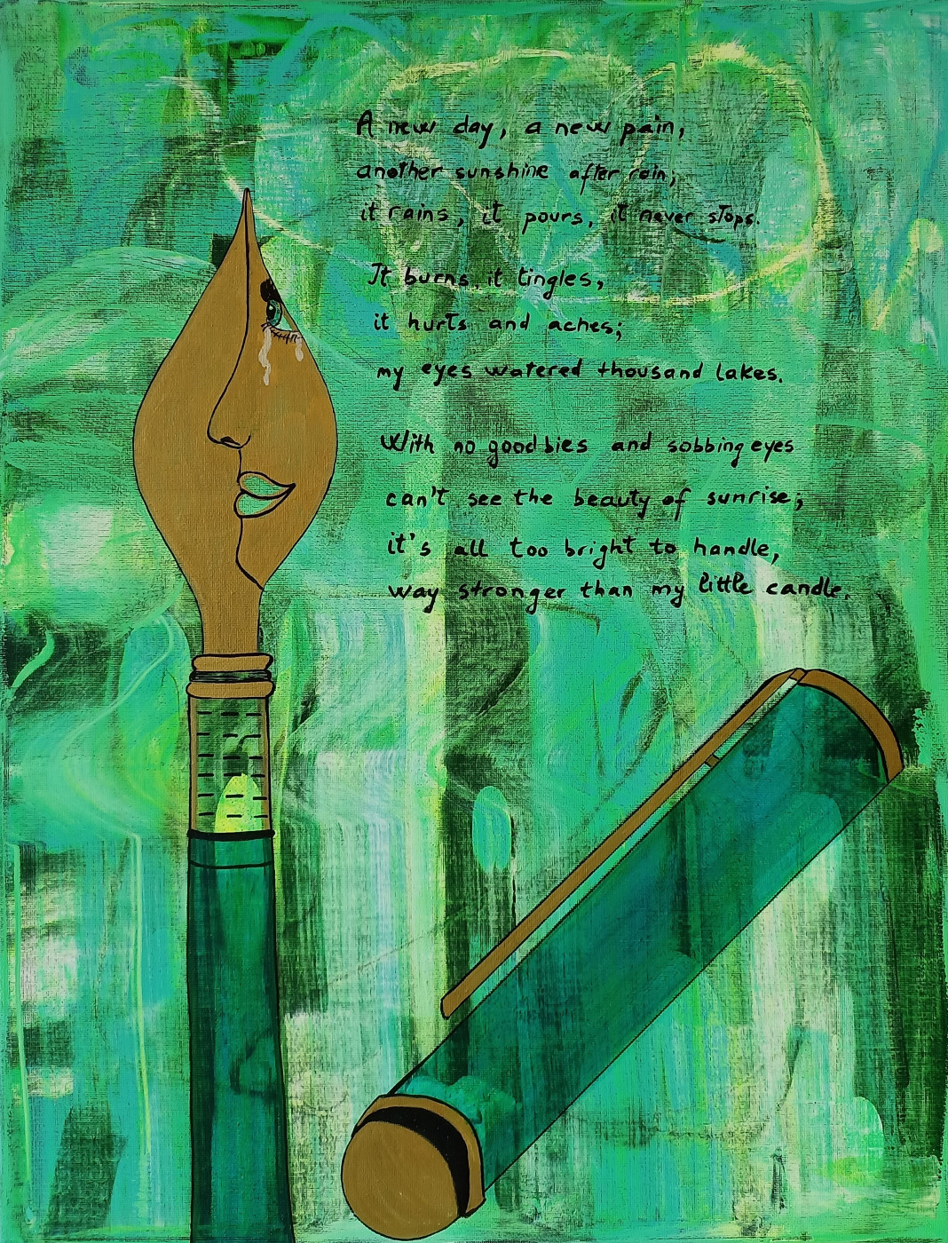 Green Pain was inspired by the artist's love for poetry and dedication to raise awareness for Lyme disease. The work aims to illustrate the struggle of a Lyme sufferer, to educate the viewer in regards with what it entails to deal with a chronic illness that has invisible symptoms. Green... Read more
