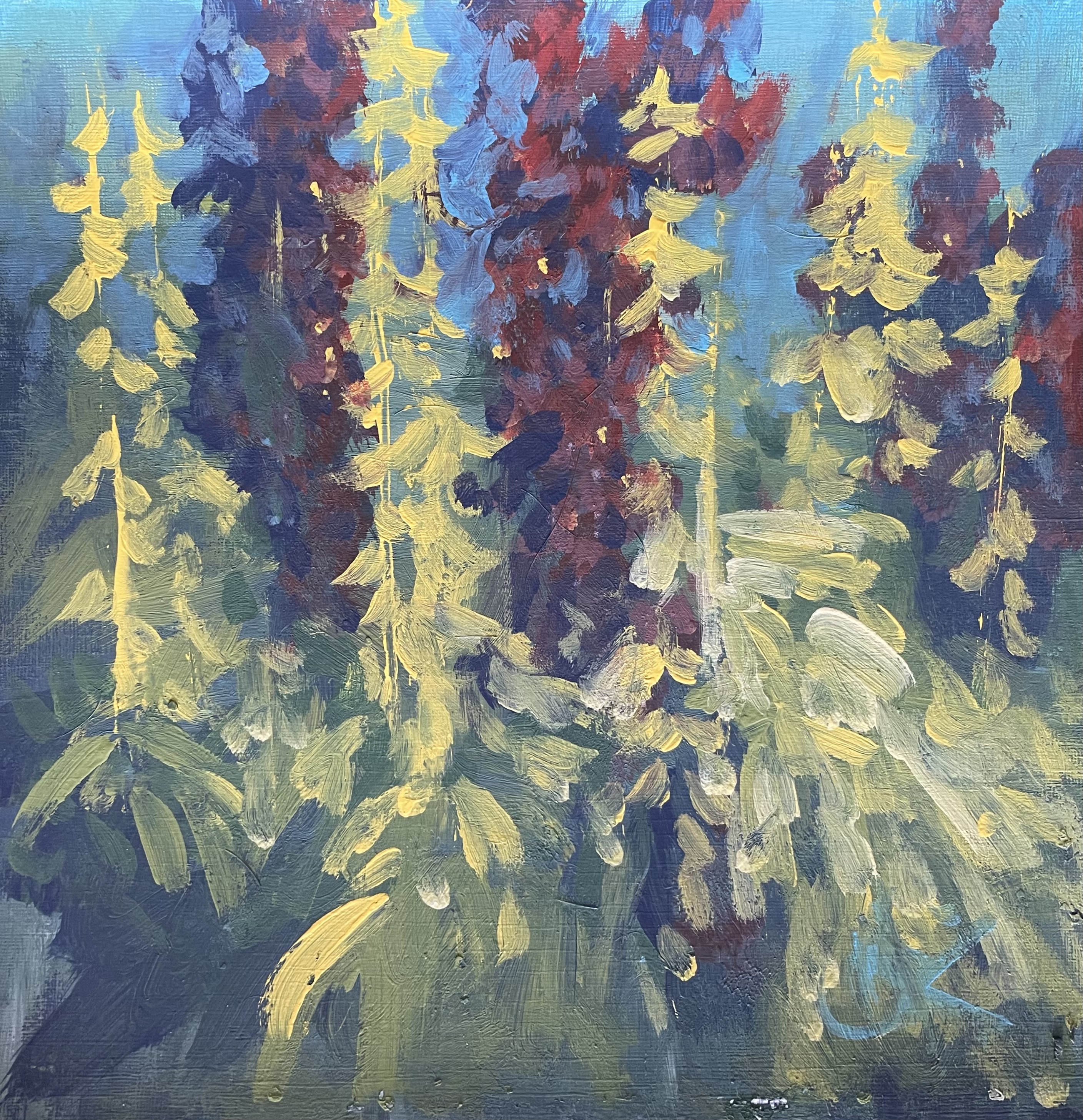 Lupin, a spring flower is an abstract acrylic painting full of colourful lupin flowers. It is painted on canvas paper. The glazes of acrylic give the colours a fun abstraction. The painting is uplifting like spring with colours like bright yellows, blues, greens, teals, and maroon. Hope you enjoy a... Read more