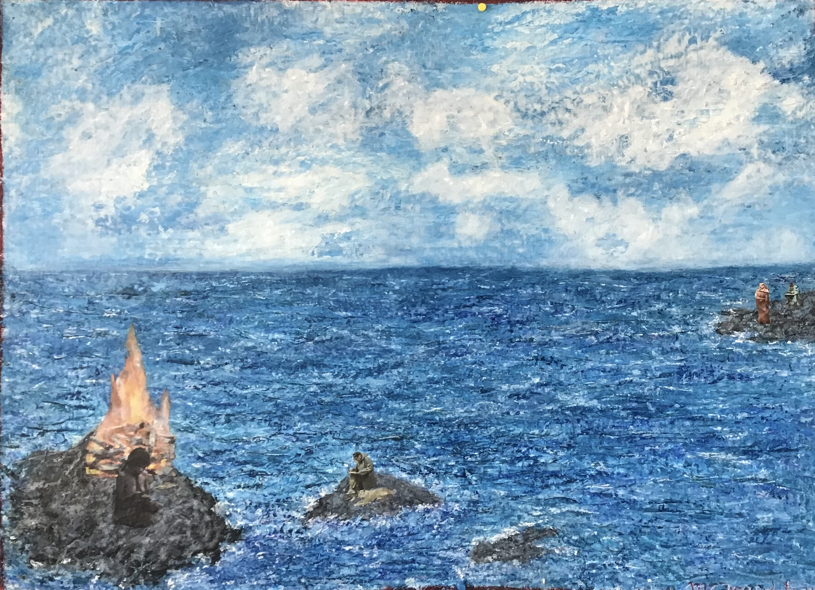 J'aime les images qui présentent un paradoxe. Ici, l'océan intense, imprévisible, pleine d'enchantements et de tourments comme la vie, et, nous, isolés, seul comme une bille, dans un espace mental hors du grand brassage de la vie... Huile et collage