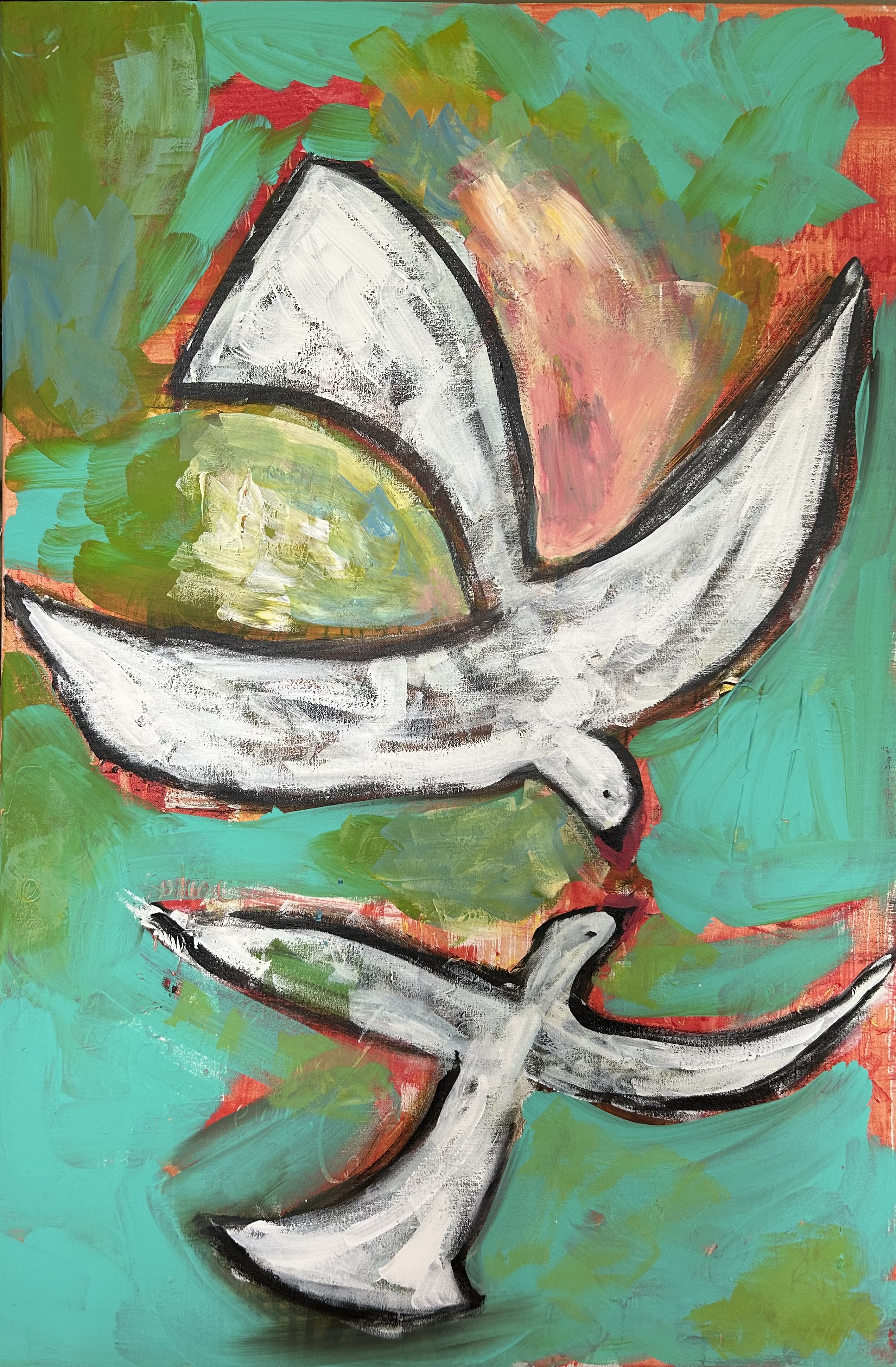 Voici une toute nouvelle série : Des toiles déjà peintes sont recyclées. L’ancienne œuvre disparaît sous la nouvelle, mais pas tout à fait. Le nouveau se construit sur l’ancien, en garde des traces. Textures, superpositions, un nouveau style complètement différent s’est imposé. De cette série plus urbaine ( Colombe Graffiti... Read more