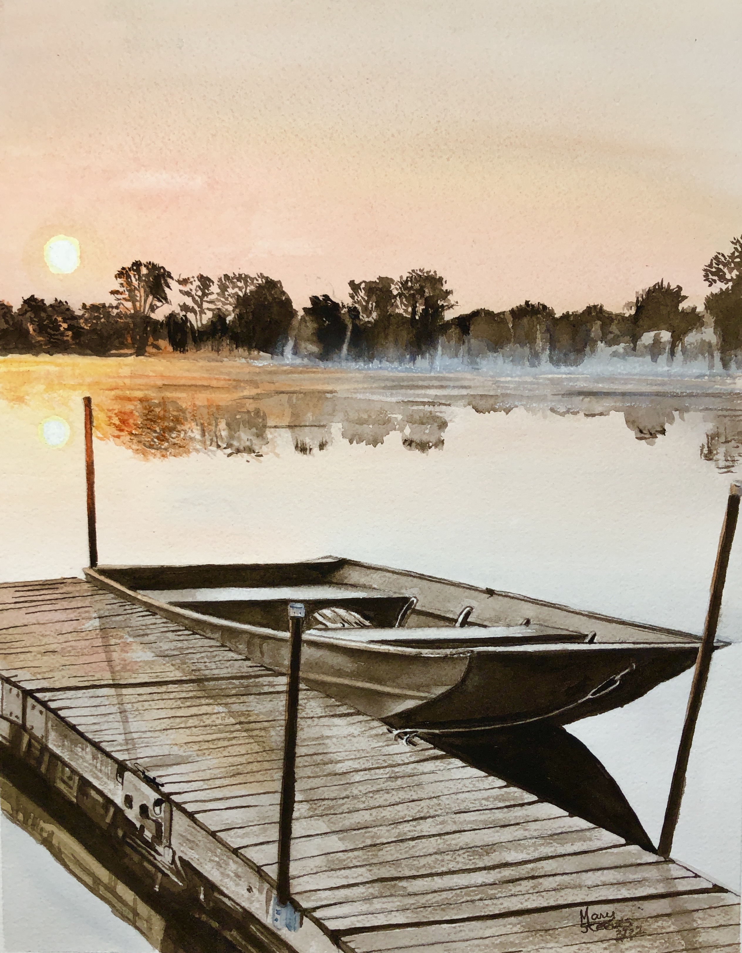 A water-colour painting depicting the calm at the end of a good day on the water. price mis without frame but a frame could be available at extra cost