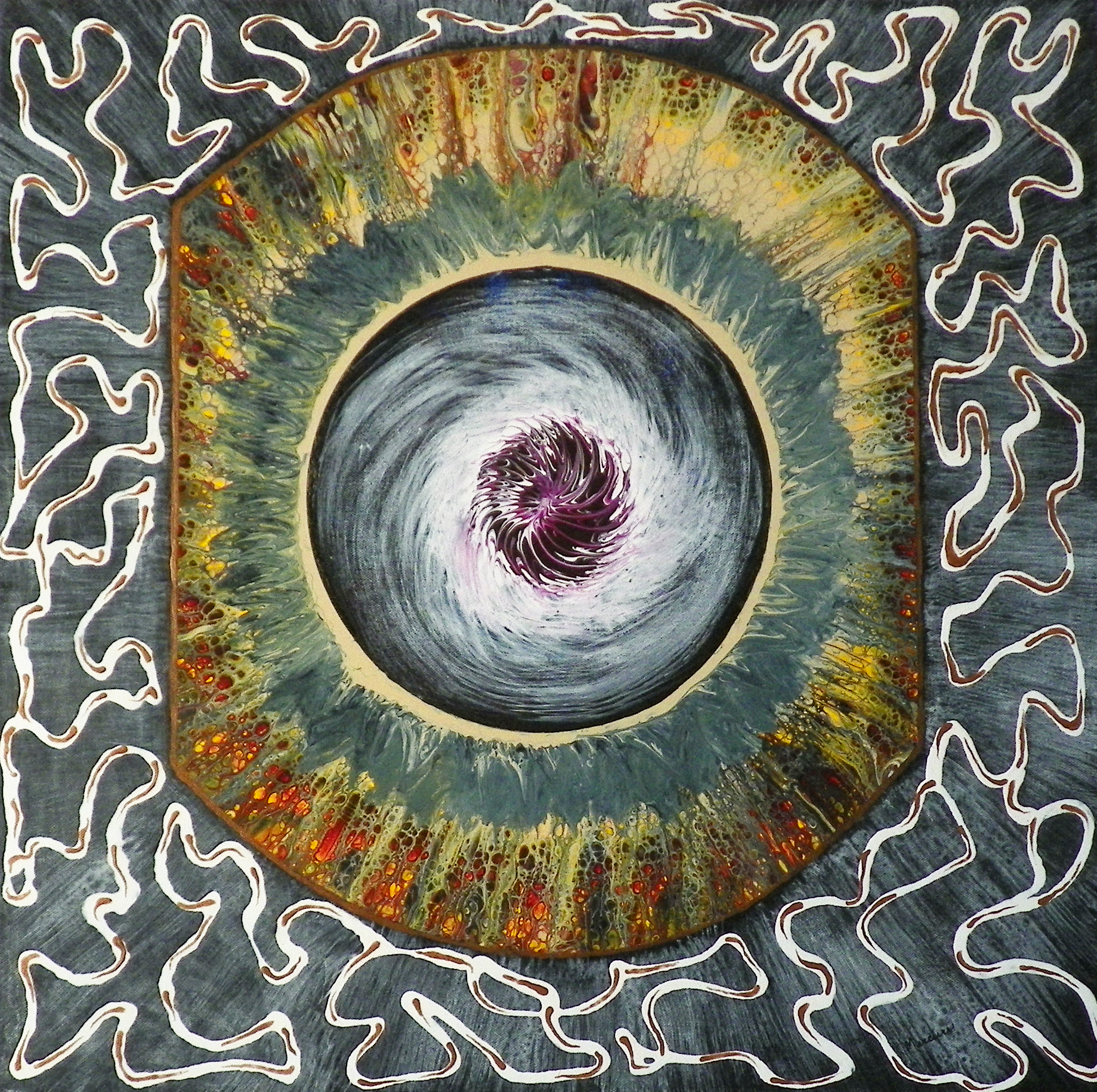 FRANÇAIS: Cette œuvre s’organise autour d’un centre magnétique qui capte immédiatement le regard. Le cœur semble aspirer et diffuser l’énergie à la fois. La spirale centrale évoque le mouvement perpétuel, le cycle, la transformation. Autour d’elle, une couronne texturée aux reflets dorés et embrasés rappelle la matière en fusion, la... Read more