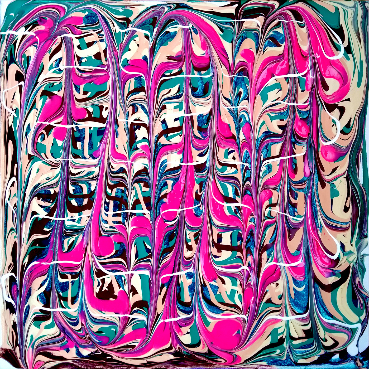 This work is a freely and thickly poured acrylic paint which was quickly stirred with sticks in a rhythmic fashion; it has both metallic and neon colours; perhaps evoking the beauty of summer.