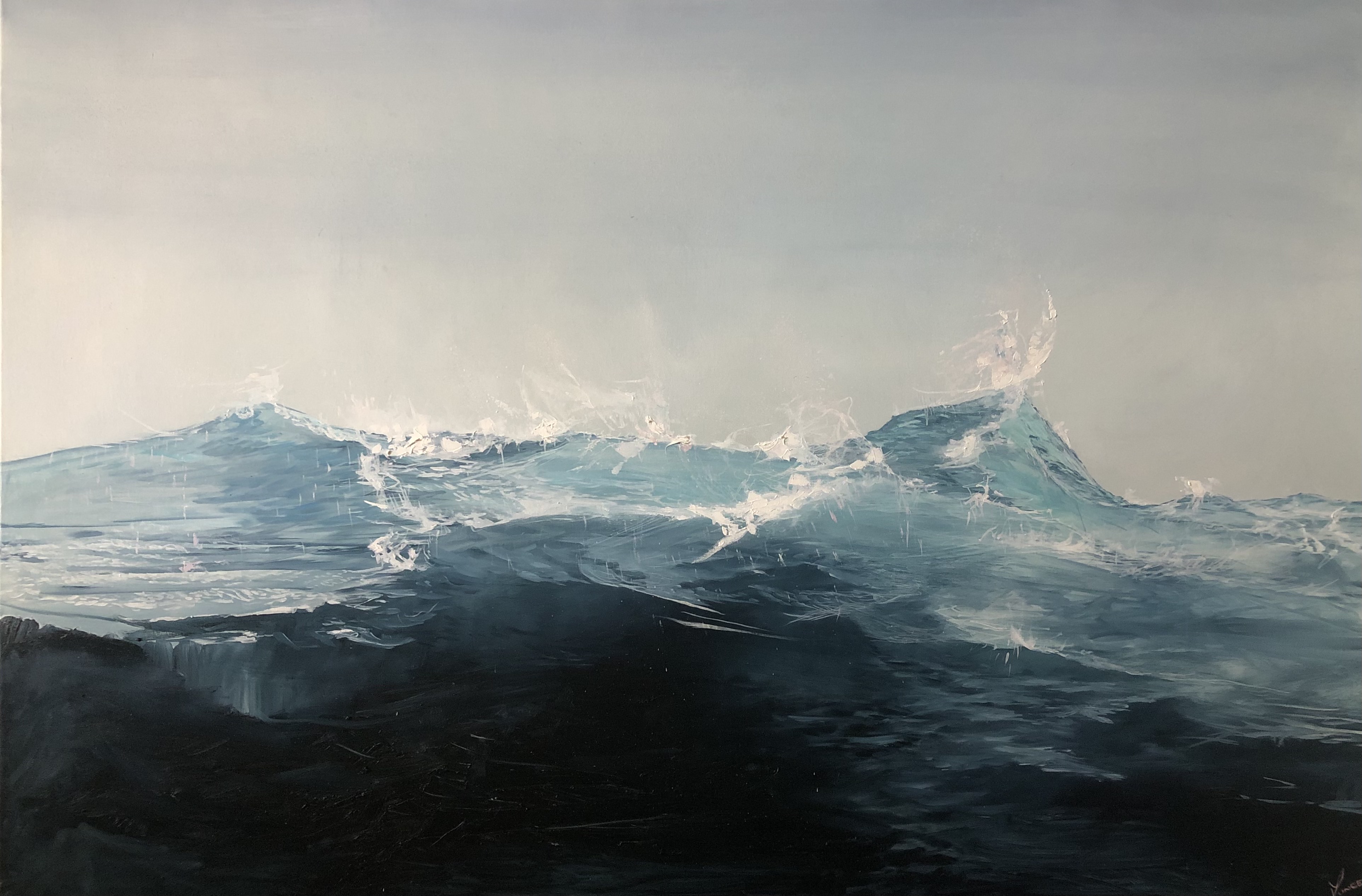 Huile sur toile, L'Echo de l’eau est une scène de paysage marin à la fois mouvementée et relaxante. Les couleurs froides de l'eau et du ciel contraste avec l'action des vagues et de la pluie.