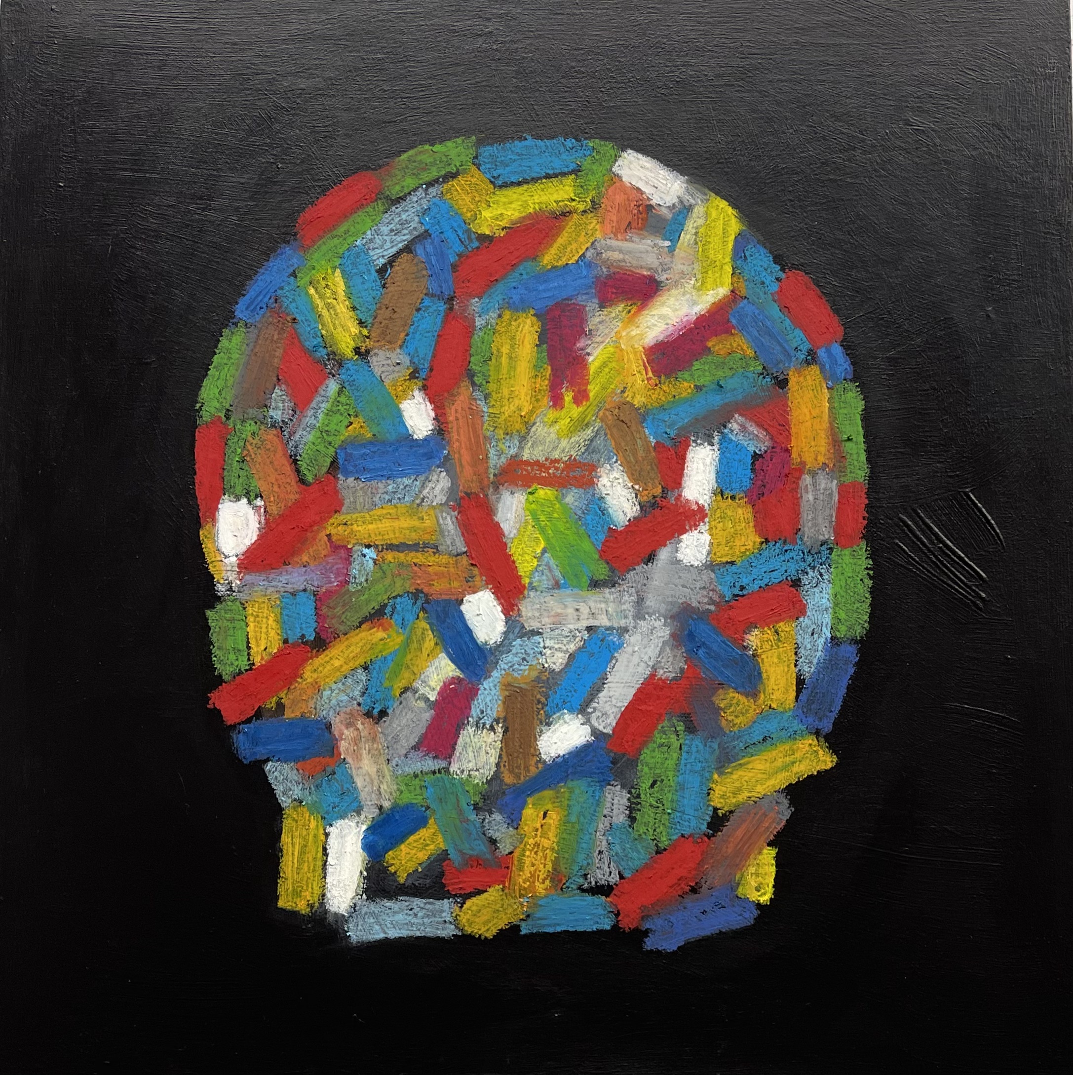 Sur un fond noir, la forme circulaire composée de hachures entrecroisées, et superposées de couleurs éclatantes se veut inhérente, affecte l’émotion et se saisit dans l’intuition d’un rapport à la sensibilité de l’oeuvre.