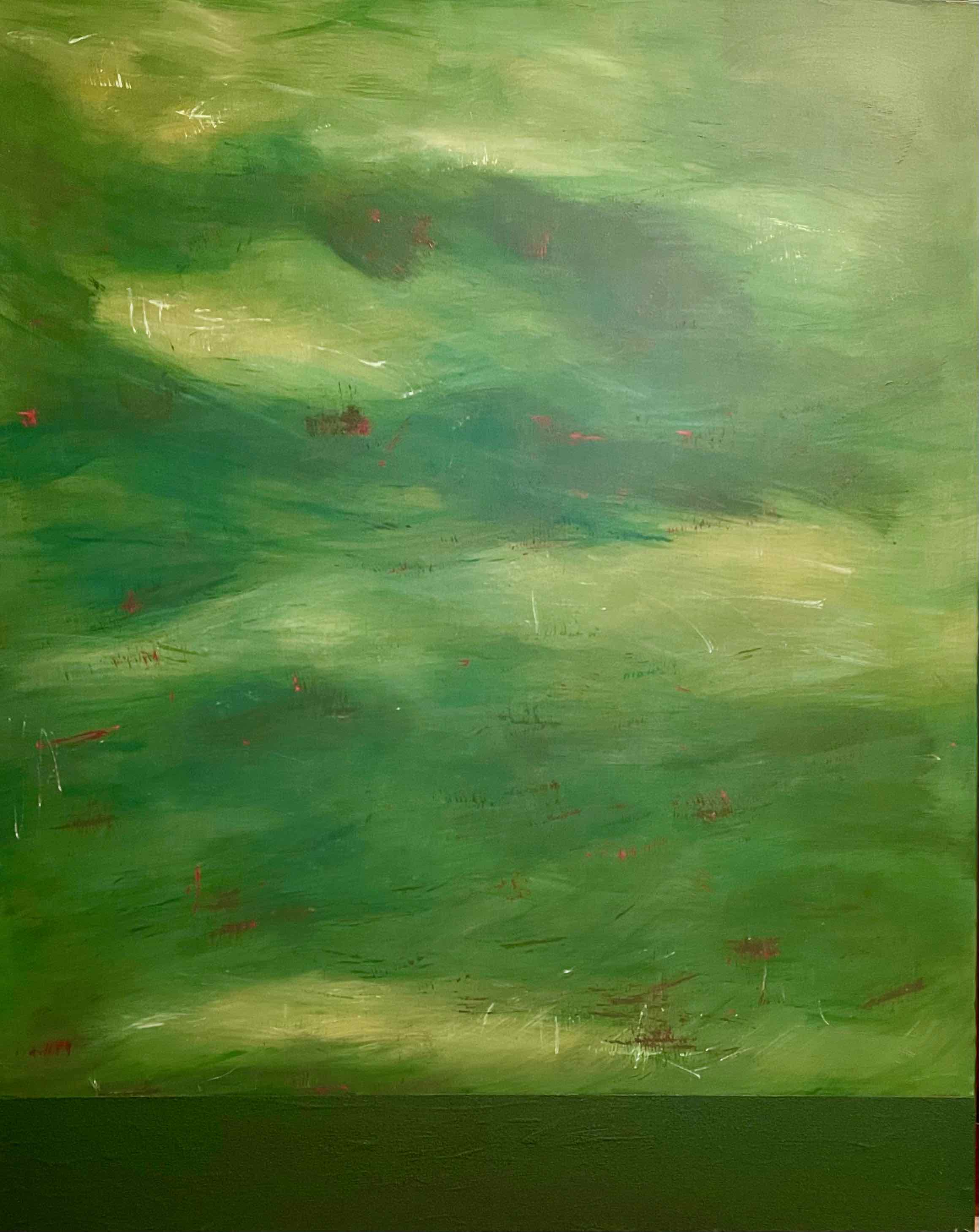 Acrylique, sable sur toile de format galerie (faux-cadre 1,5po). Un monochrome de vert. Entre le bleu et le jaune, cette couleur résulte de leurs interférences chromatiques. Chaque printemps, la terre se revêt d’un nouveau manteau vert et redevient nourricière. Elle se veut la couleur du règne végétal se réaffirmant. Quelques... Read more