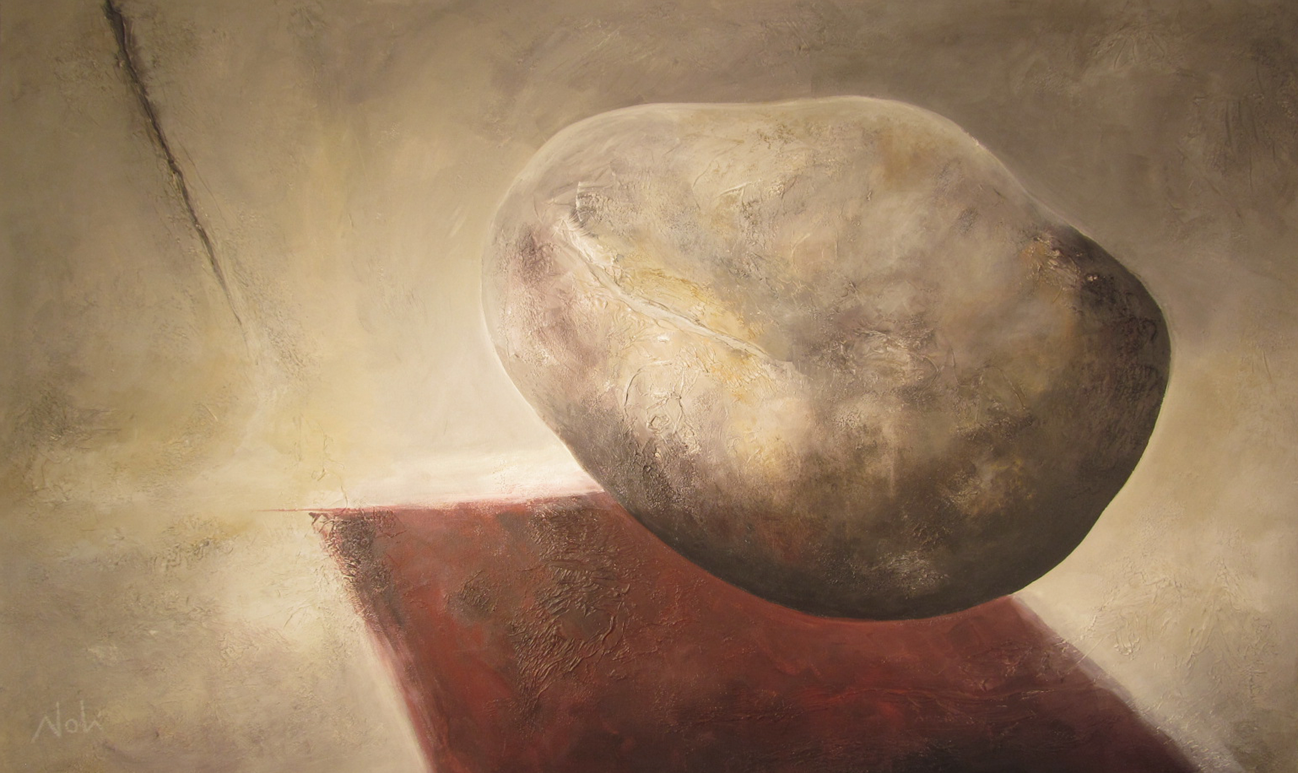 Une roche lévite au-dessus d'une zone rouge rectangulaire qui dramatise son état. Suie noire, cicatrices et autres stigmates témoignent de son passage dans le temps.