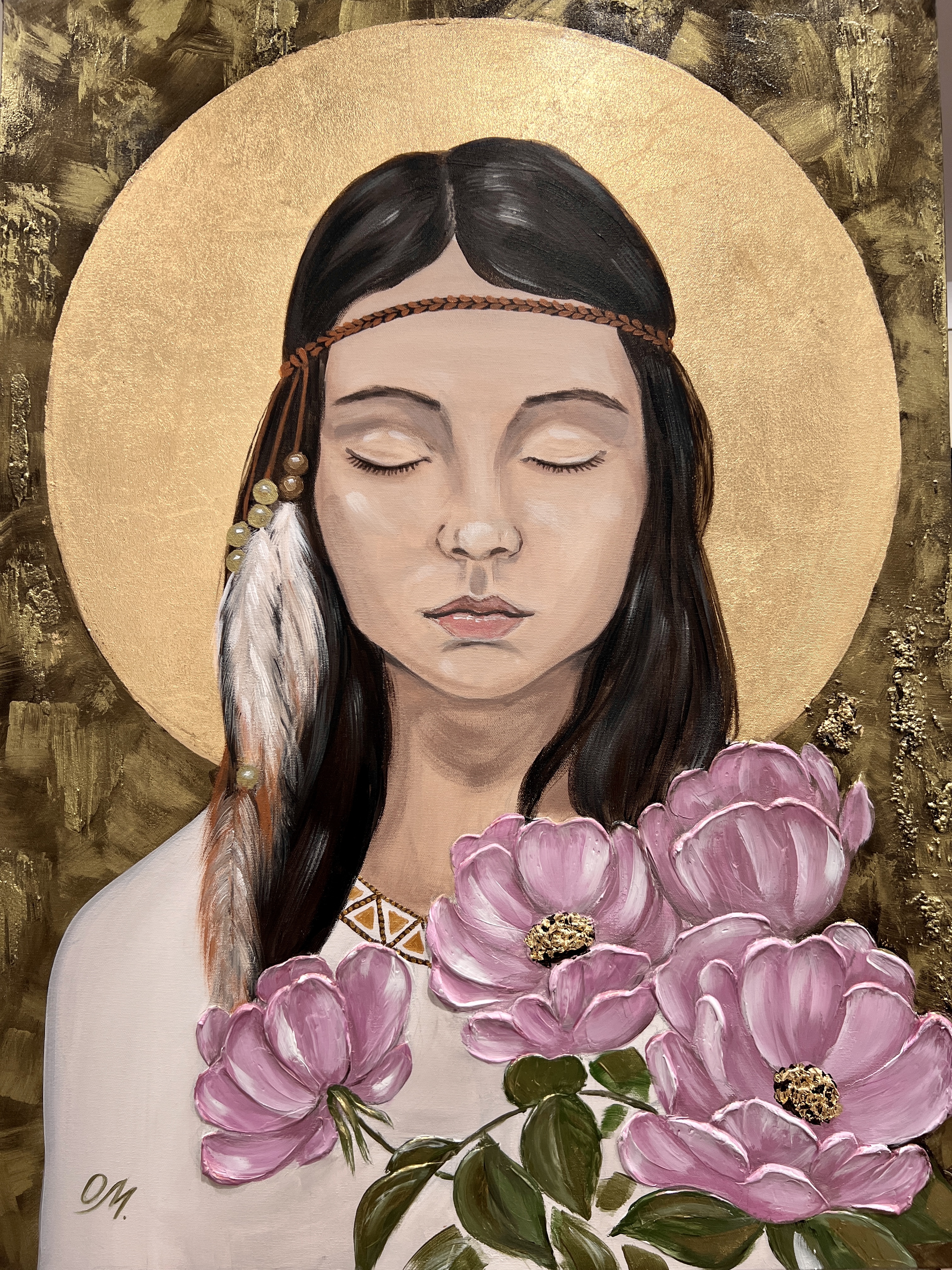 Textures acrylic and gold leaf painting. Neakita is Native American girl's name meaning "wild rose". To Native Americans in many western tribes, wild roses were a symbol of life. It also represents survival and vitality...
