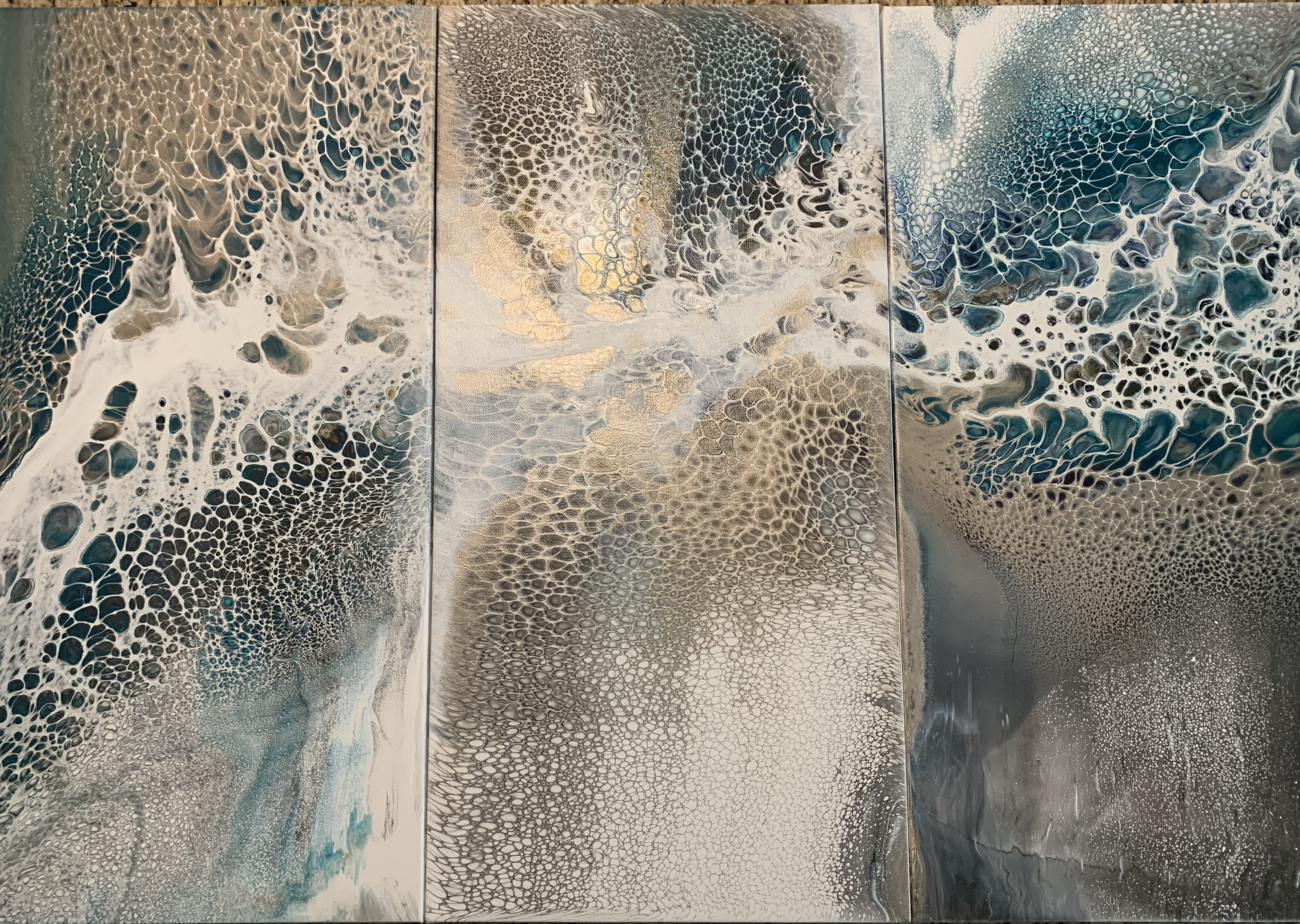 Triptych, 3 canvases 12"x24" capturing ocean waves, it is a swipe technique, using acrylic Paint and mica powder and metallic paint in champagne colours.