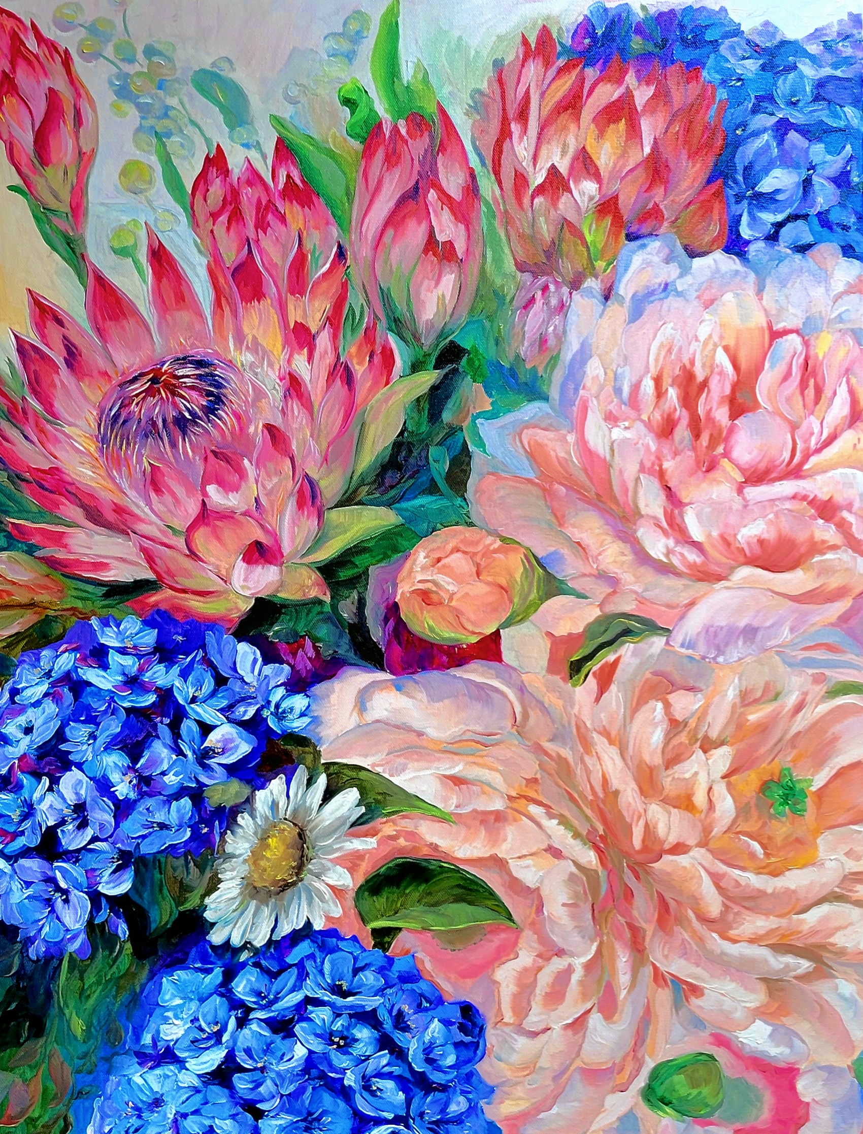 Dans cette tableau la source de lumière semble douce et naturelle, soulignant les plis et la translucidité des pétales. Cela crée un jeu vivant de luminosité et d'ombre, renforçant la dimensionnalité du tableau. La composition globale de cette peinture dégage un sentiment de vitalité et d'élégance, rappelant les natures mortes... Read more