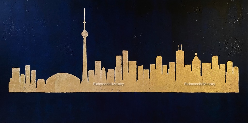 "Toronto by the night" is an artwork inspired by the beautiful skyline of Toronto as seen from the Toronto island. This original skyline artwork is made with gold leaf and acrylics. The background is shades of black, deep blue, purple and with a very light sprinkle of glitter to represent... Read more