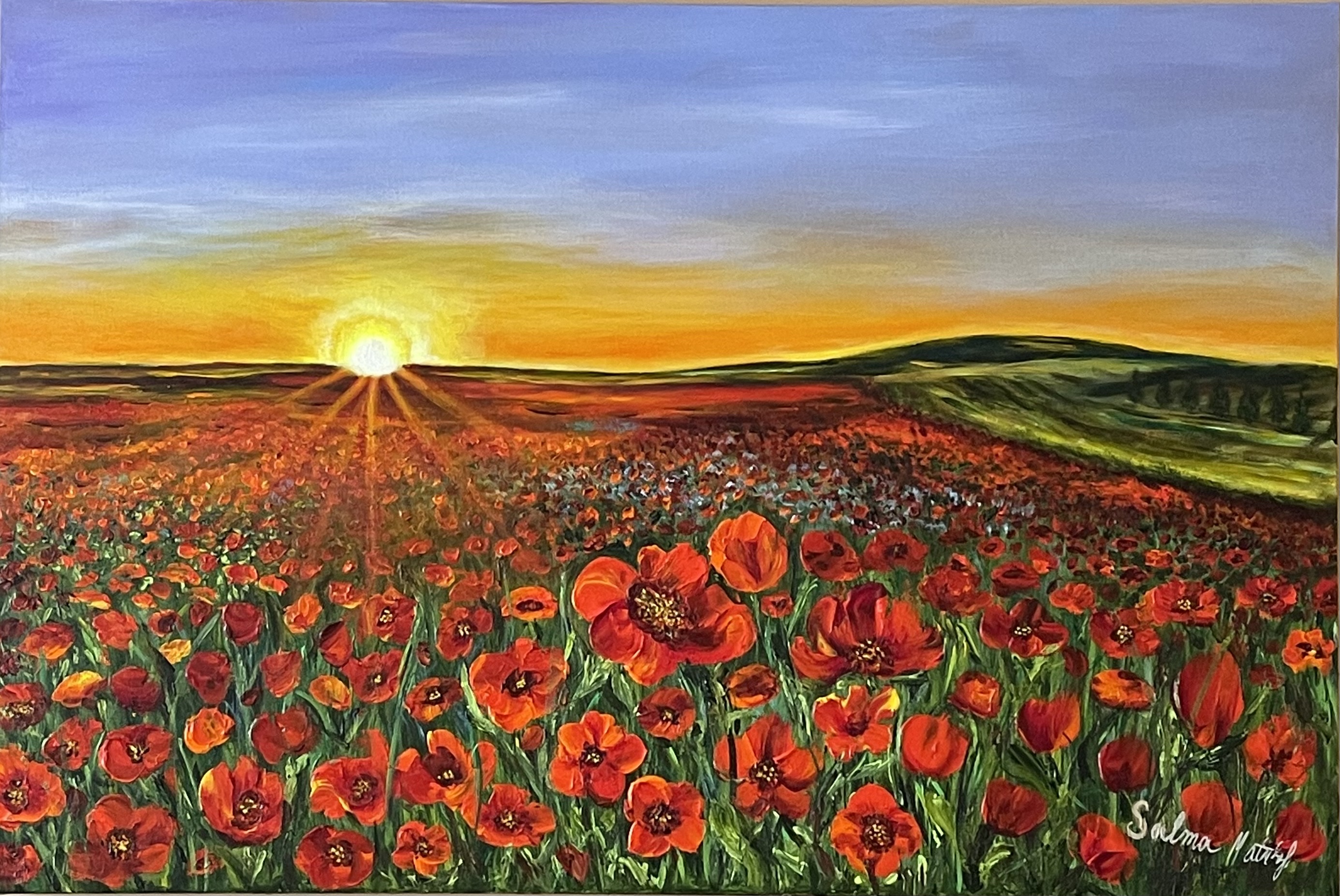 The Poppies Blow - Original acrylic colour painting on canvas - 24x36 inches. Surface: stretched gallery canvas Dimensions: height 24 inches; width 36 inches; depth 1.5 inches Description: A field of poppies at sunset. Painting is signed front and at the back, wired and ready to hang. A Certificate of... Read more