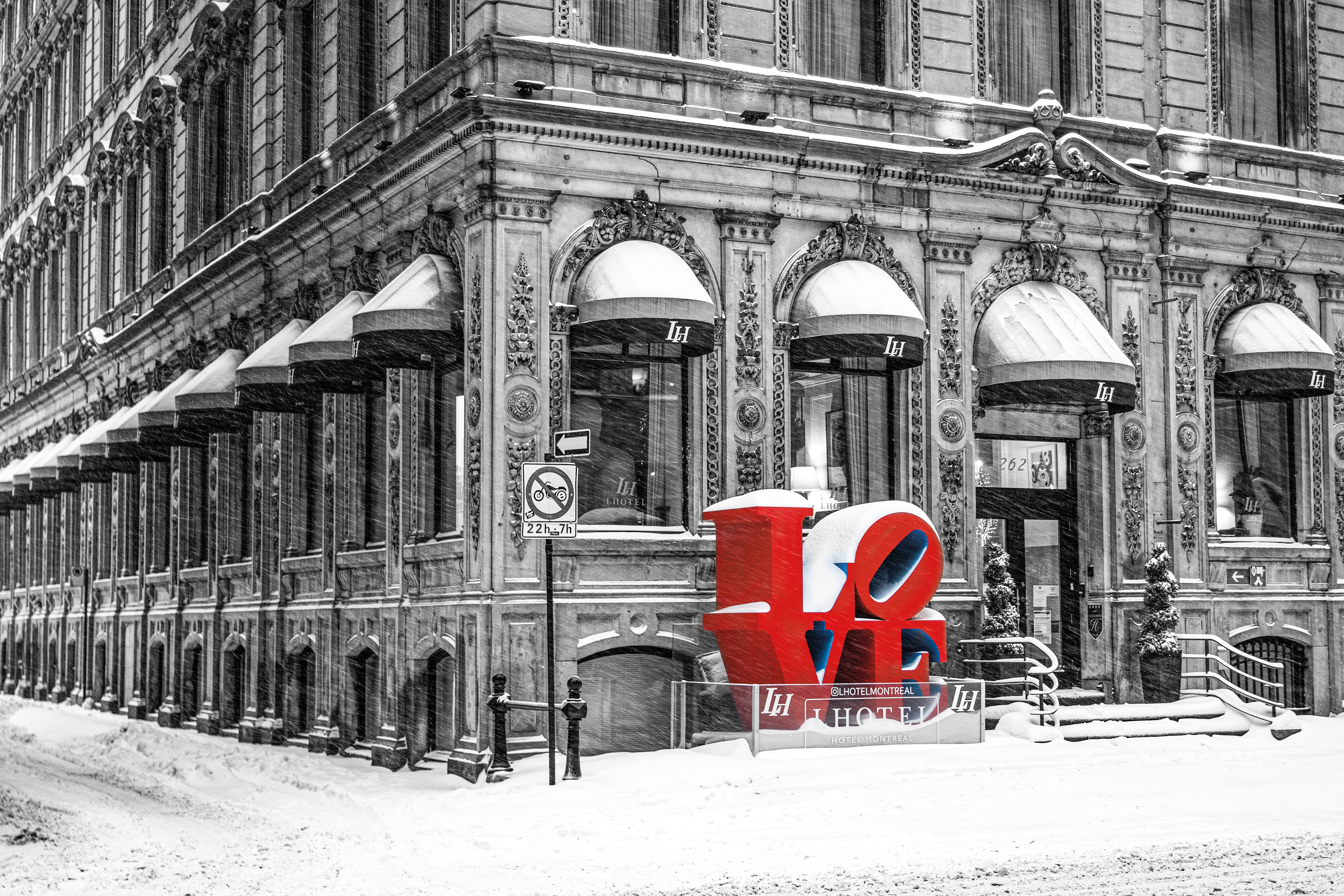 A wintry scene of the unique art boutique hotel, LHotel Montréal located in Old Montreal. I converted the photo to black and white to enhance the architecture and decided to leave the "LOVE" in red. My prints are facemounted to acrylic. Each image is printed using a genuine smooth gloss... Read more