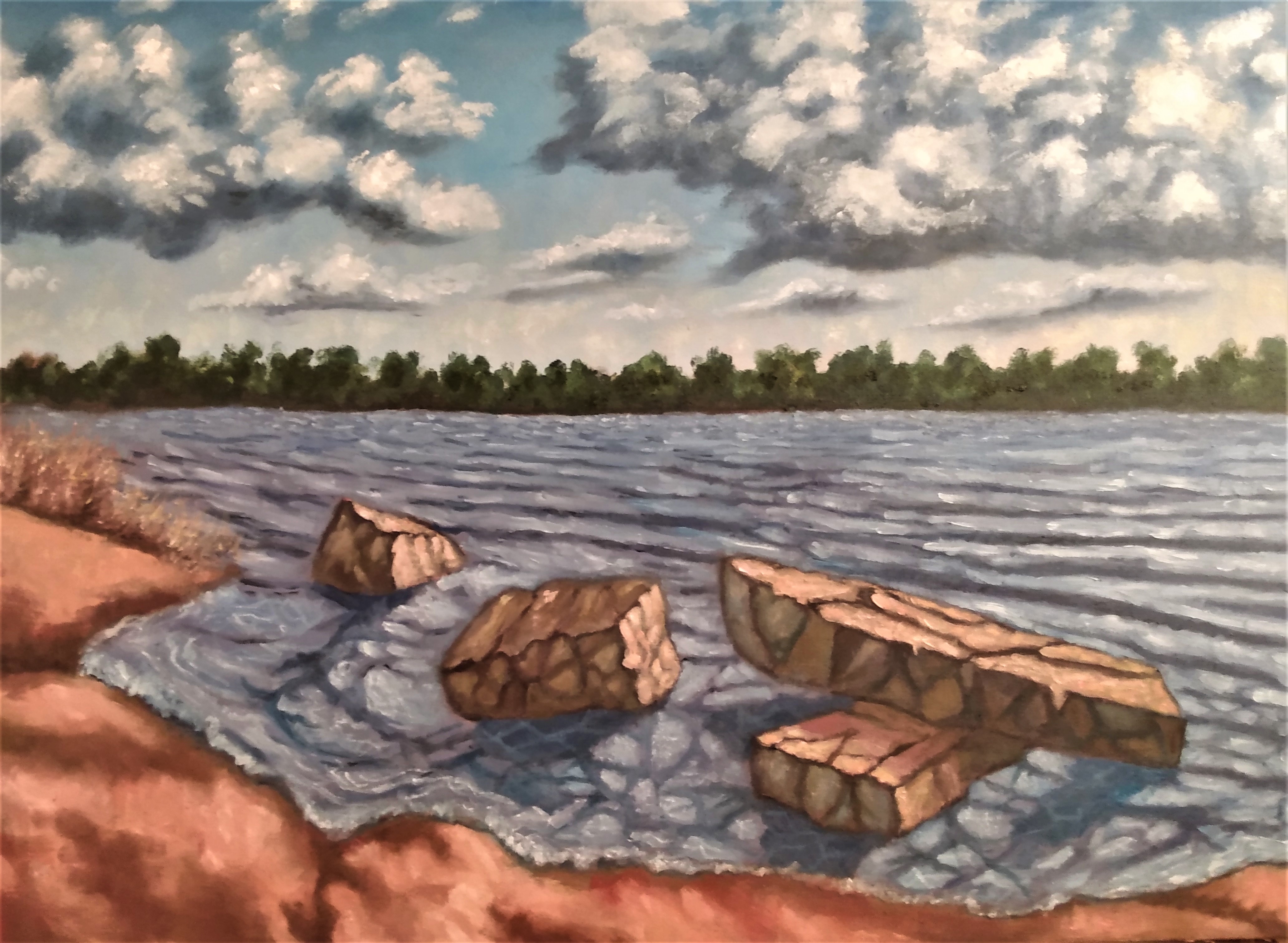 Original artwork. Canvas screeched on wood panel. Overcast sky over lake.