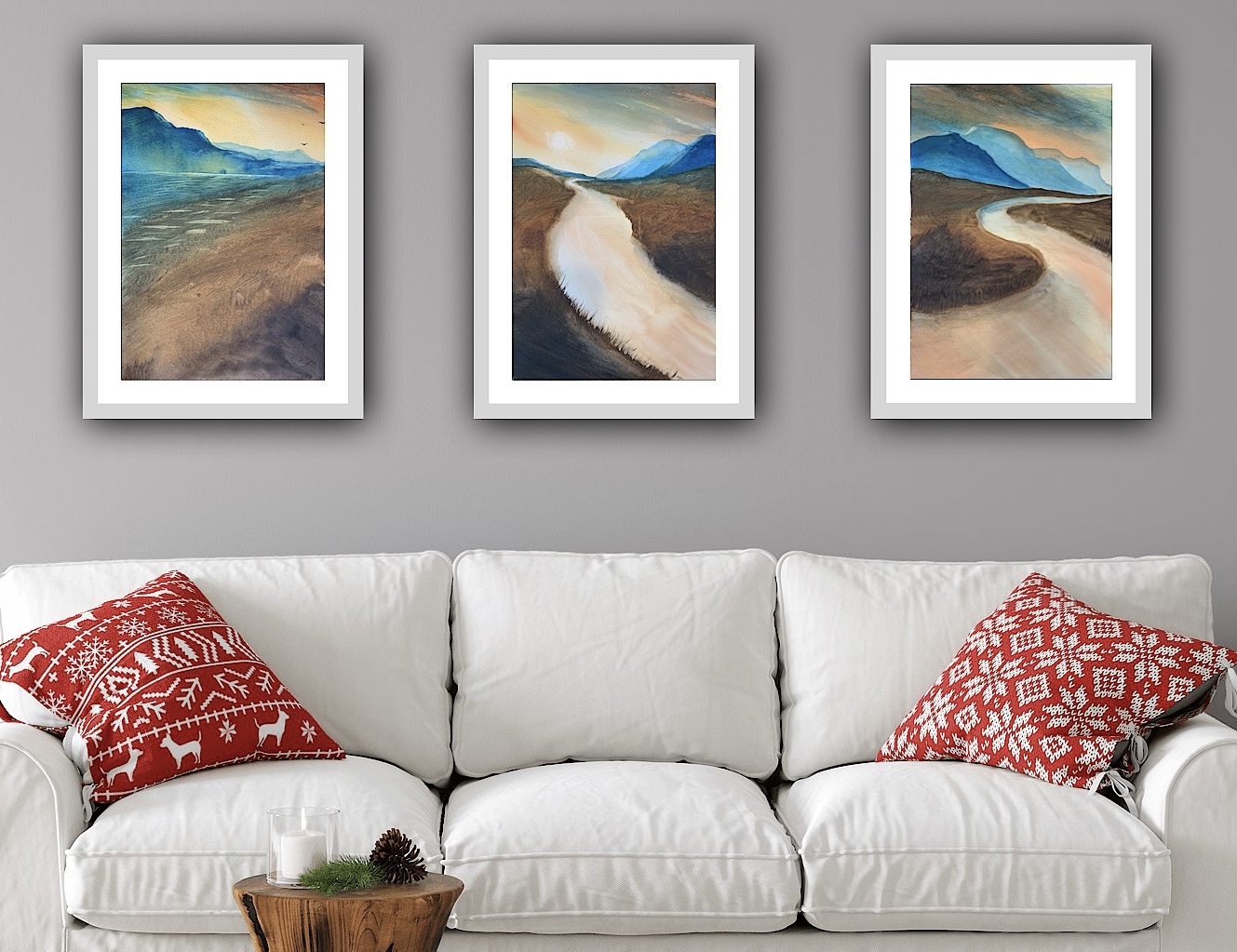Triptyque Entre lac et montagnes. Trois aquarelles 10x14 pour un total de 16x38 pouces sur papier coton grain fin. Lumière d’un soir dans Charlevoix. Oeuvres originales encadrées. Voir produits individuels pour zoomer.
