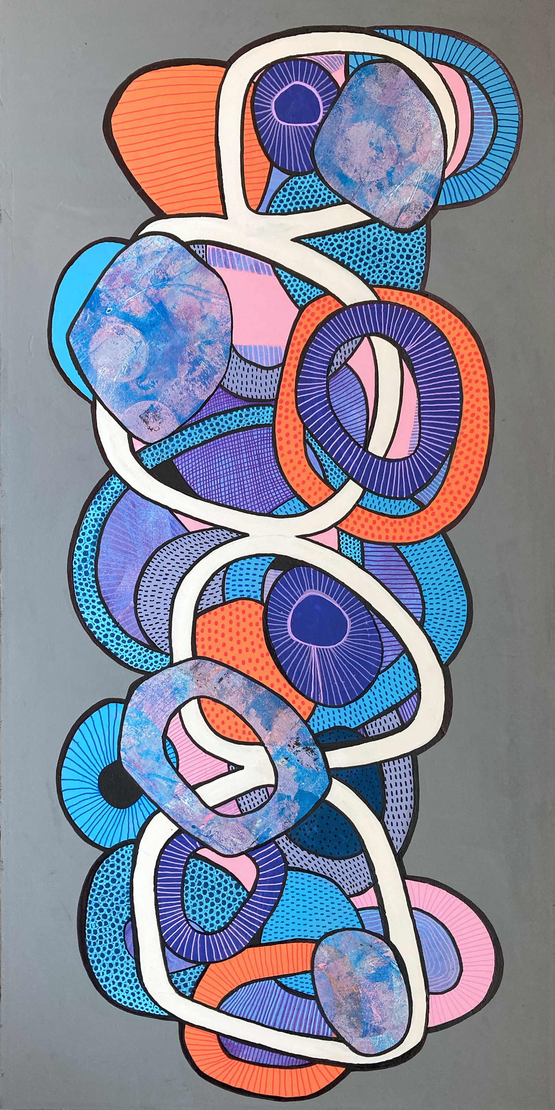 Synthèse est une oeuvre originale peinte à l’acrylique incluant du collage de monoimpressions et des détails appliqués aux crayons posca à l’encre acrylique opaque sur toile . Dans la collection «cultiver la joie et les sentiers irréguliers» celle-ci est un jeu de cercles diamétralement irréguliers, qui s’entremêlent et se croisent... Lire plus