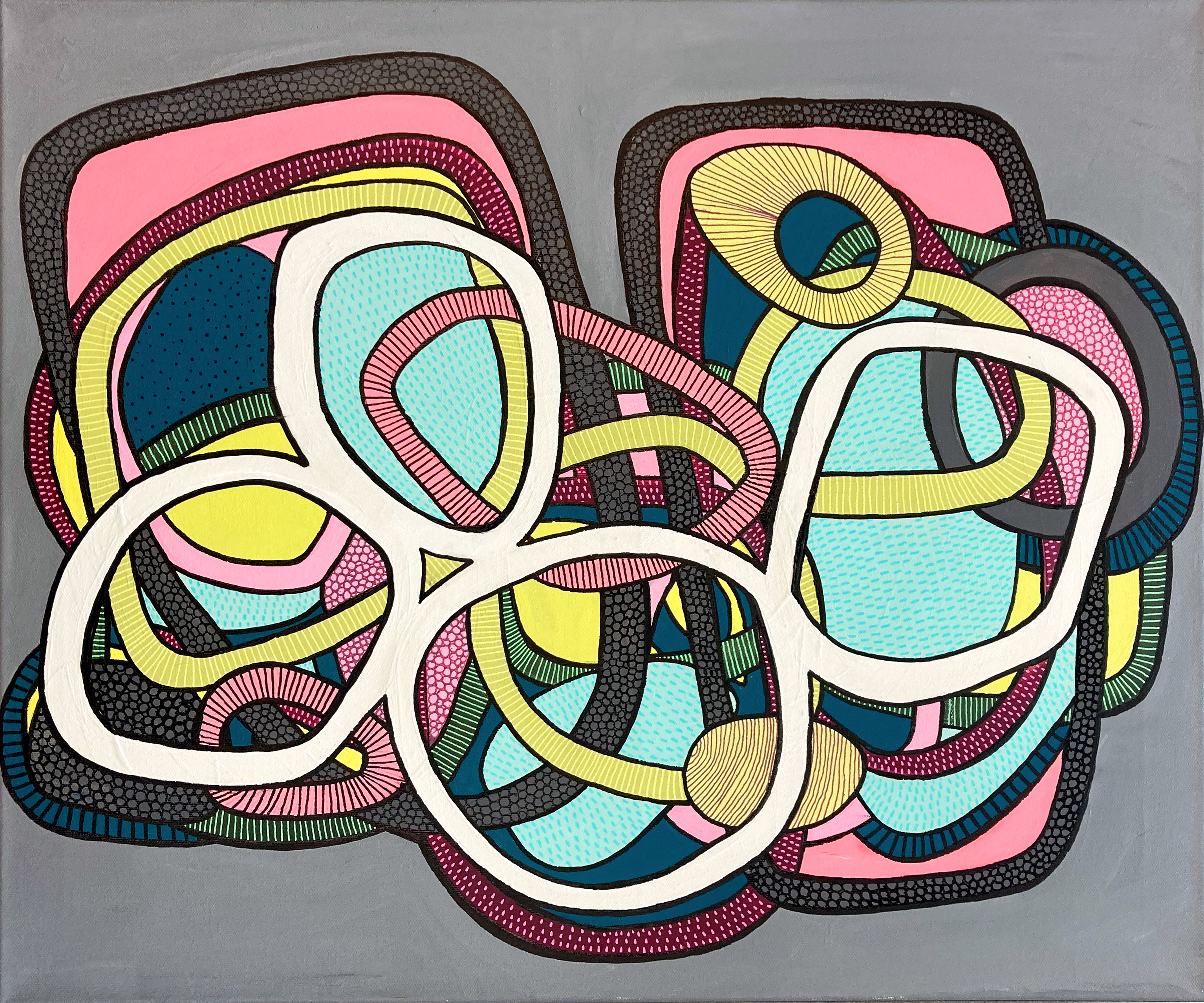 « Convergence » est une oeuvre originale peinte à l’acrylique, les détails sont minutieusement appliqués aux crayons à l’encre acrylique opaque sur toile . Dans la collection « cultiver la joie et les sentiers irréguliers » celle-ci est un jeu de cercles diamétralement irréguliers, se rassemblant comme dans un centre... Lire plus
