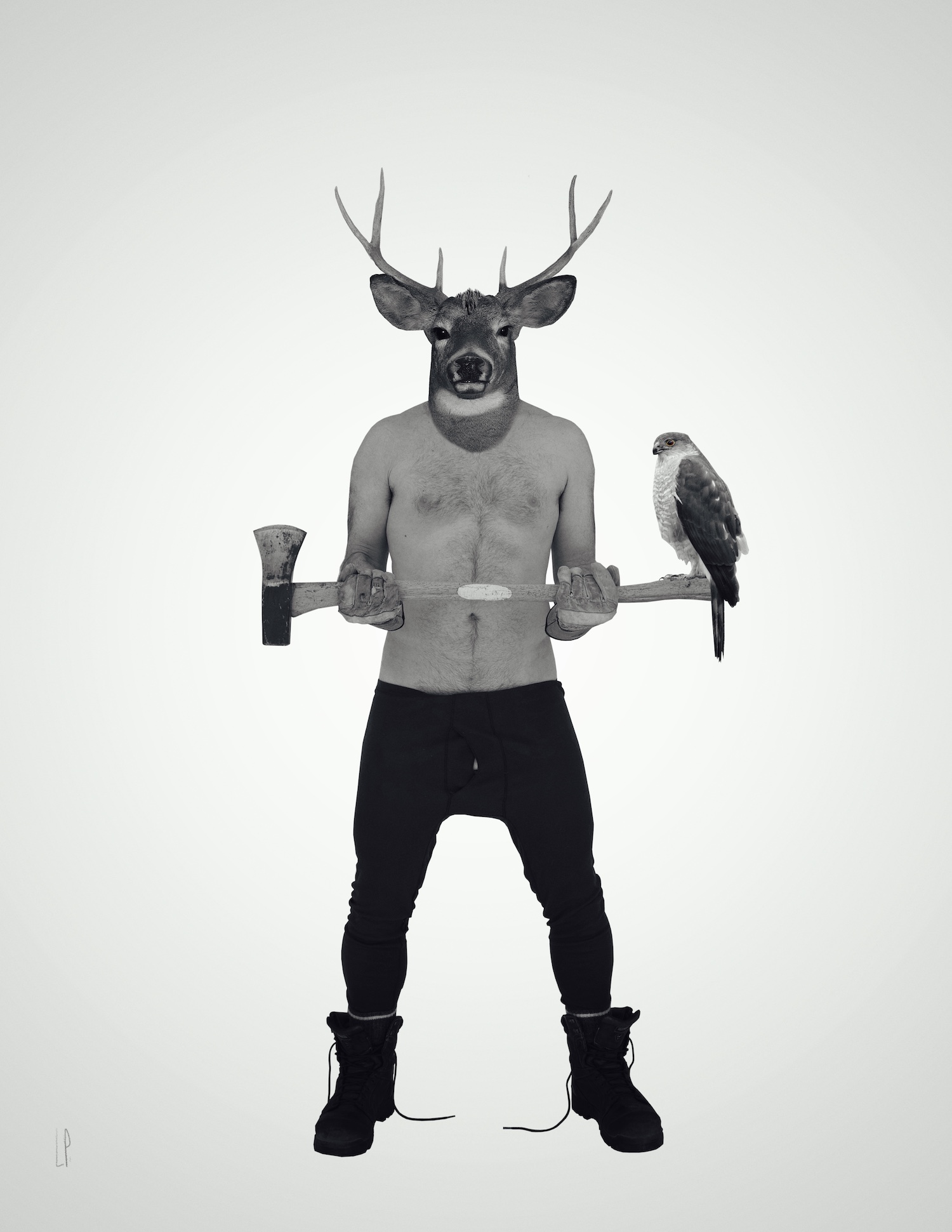Dans cette scène, ce très masculin personnage à tête de cerf pose tenant une hache devant lui sur laquelle est posé un épervier de Cooper. La série figure une harde de 19 personnages à têtes de cerfs, peu vêtus et souvent porteurs d'objets symboliques. Amorcée en 2013, cette suite photographique... Lire plus