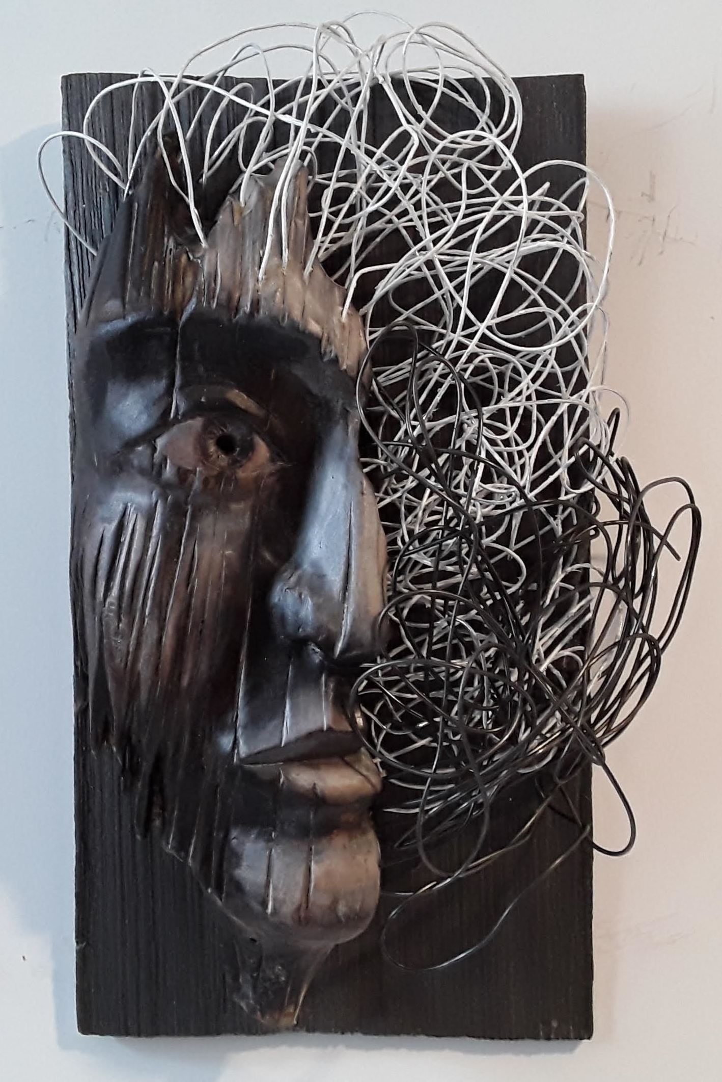 Haut-relief en tilleul brûlé et teint, fils d’acier peint, fils de laiton, vernis, 33.02 x 17.78 x 10.16 cm, Poids: .22 kg. 2022. SC2201 . Peut se placer sur un mur ou sur un présentoir. Pour connaitre la démarche et la vision de l'artiste concernant cette œuvre : https://luciencproulx.blogspot.com/ High... Lire plus
