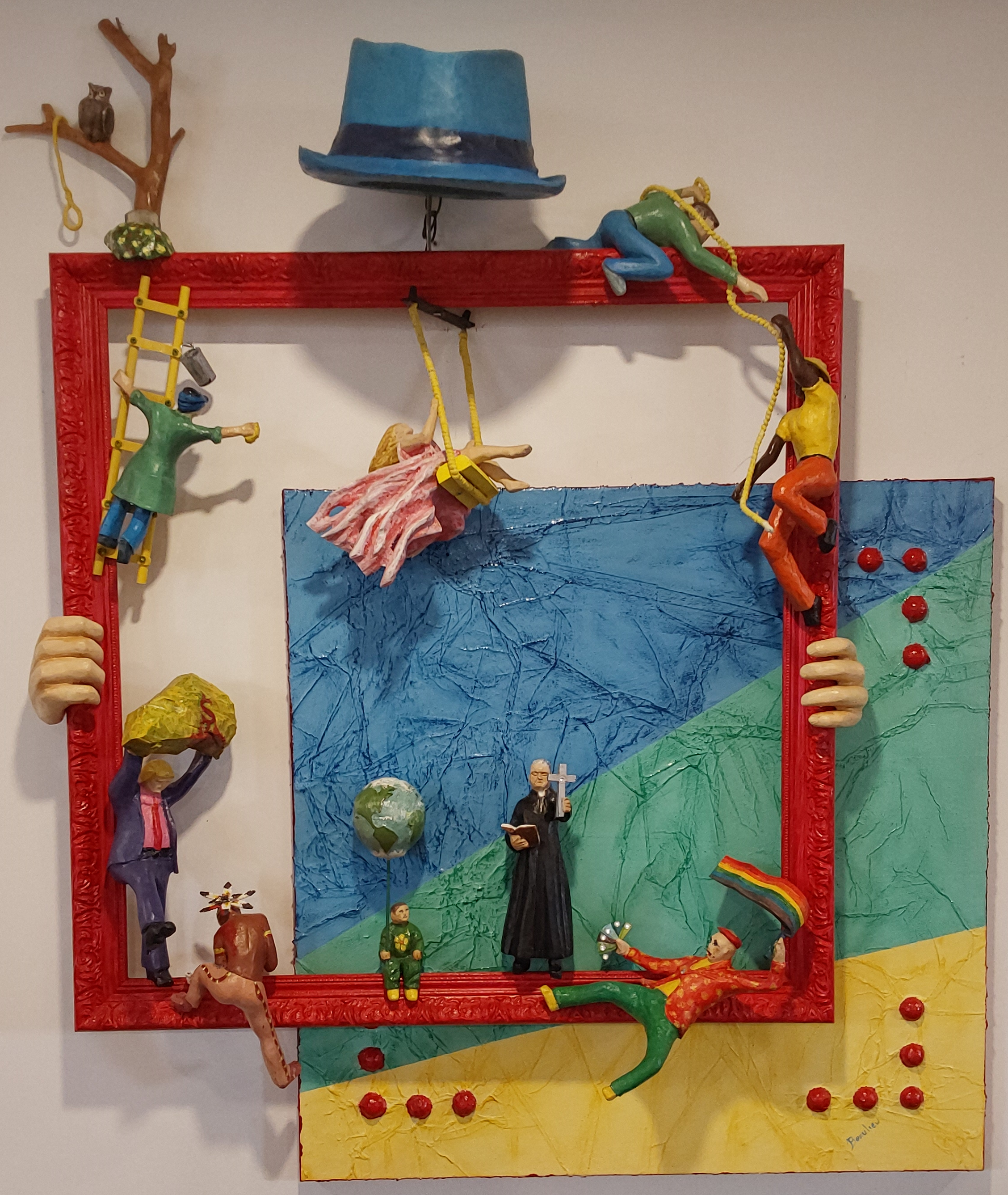 Œuvre en duo. 12 sculptures en tilleul, pin, bouleau et cadre en aggloméré, polychrome d’acrylique, papier, toile, laiton, styromousse, vernis. Toile de Joanne Beaulieu, artiste peintre. 101,6 x 128.7 x 17.78 cm. Poids :4.08 kg. SC2301. 2024. Pour connaitre la démarche et la vision de l'artiste concernant cette œuvre :... Lire plus