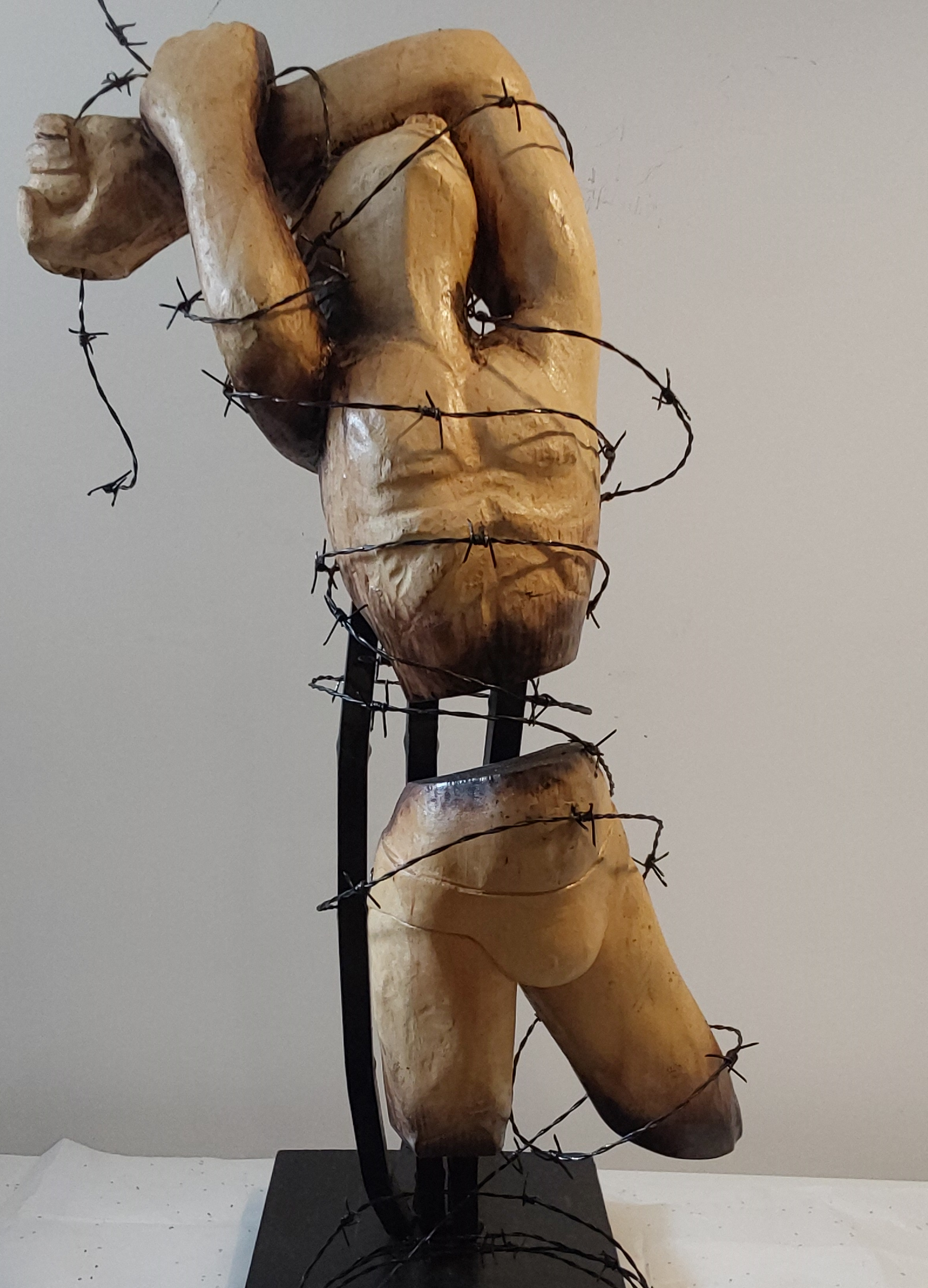 Résilience. Tilleul, base en pin, support et broche de métal, technique de bois brûlé, peinture, vernis, 83.36 x 27.94 x43.18 cm. Poids 3.17 kg. 2024. SC2401 Pour connaitre la démarche et la vision de l'artiste concernant cette œuvre : https://luciencproulx.blogspot.com/ Resilience. Basswood, pine base, metal support and spindle, burnt wood... Lire plus