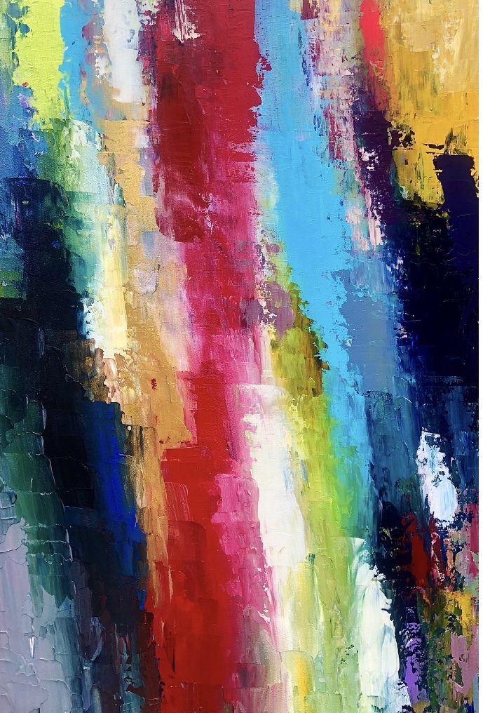 Cet abstrait aux couleurs traditionnelles de la Fierté qui s'entrecroisent porte un ruban rouge en plein milieu afin de mettre de l'avant ceux qui vivent avec le VIH afin de lutter contre les stigmas et les préjugés.